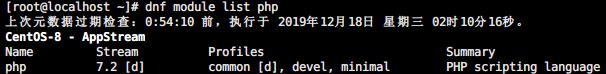 目前 RHEL 8 / CentOS 8 的 AppStream 中默认的 php 版本为7.2, 可以执行 sudo dnf module list php 查看下