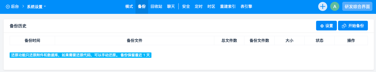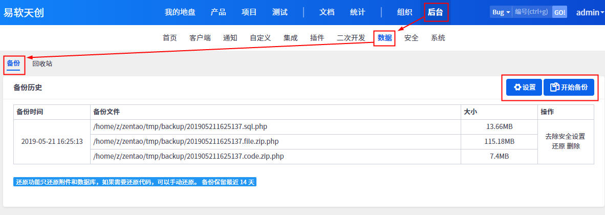 注:禅道18.2后,数据备份设置位置做了调整,由原来的后台——数据——备份改为后台——系统设置——备份。