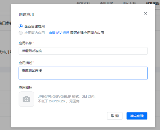 在创建企业自建应用页面中维护基础的信息后点击“创建”