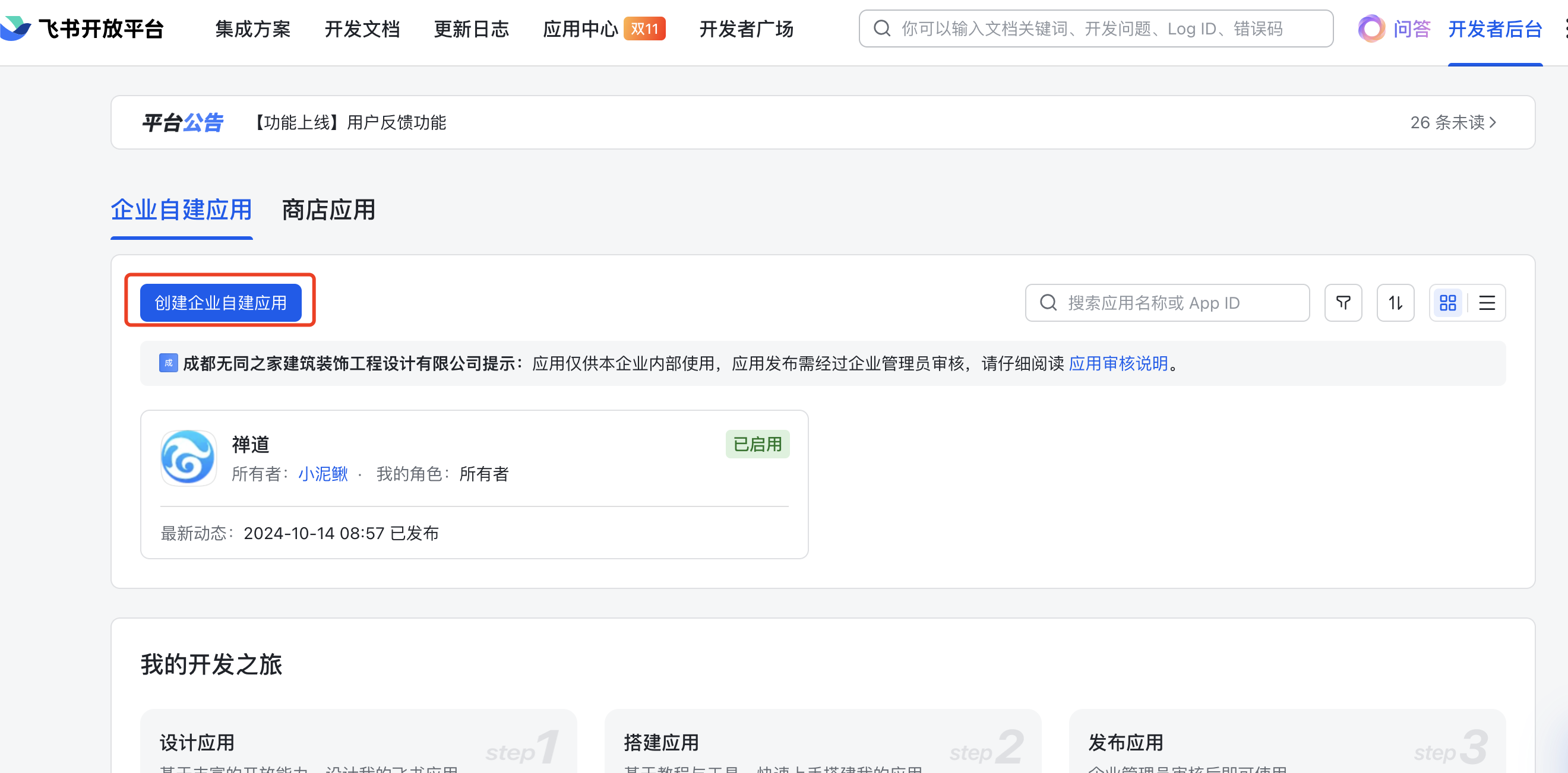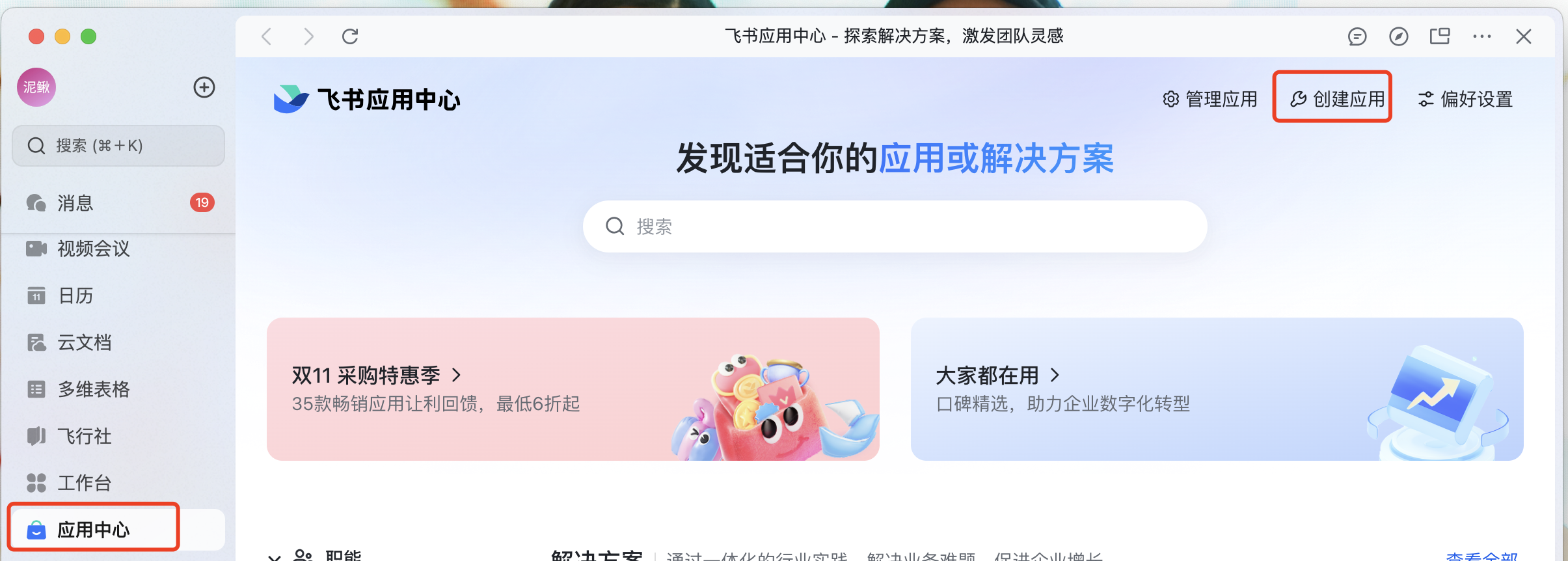 在飞书客户端中进入“应用中心”,选择“创建应用”