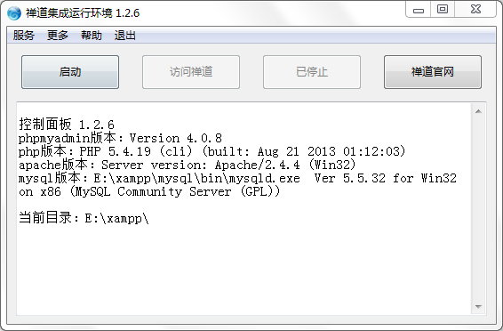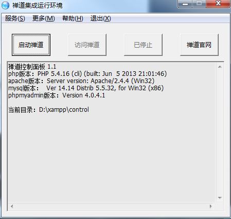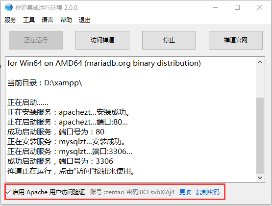 3.1 启动集成面板之后,点击“启动禅道”按钮,系统会自动启动禅道所需要的apache和mysql服务。