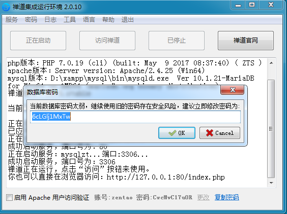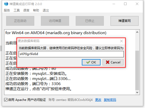 禅道服务启动后,会提示数据库密码太弱,建议修改密码。