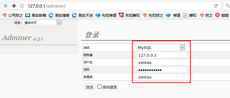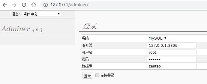 在登录页面填写 xampp/zentao/config/my.php 里的对应参数,即可进入禅道数据库。