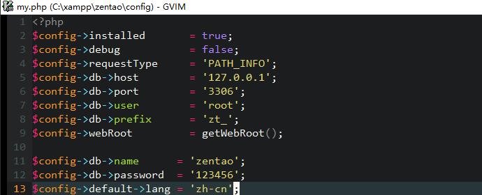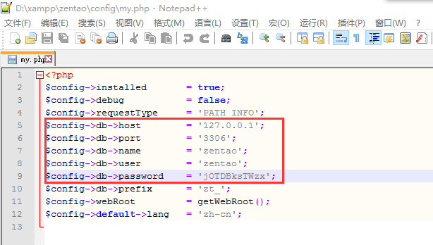 数据库:对应填写下图的$config->db->name = 'zentao '中的zentao 。