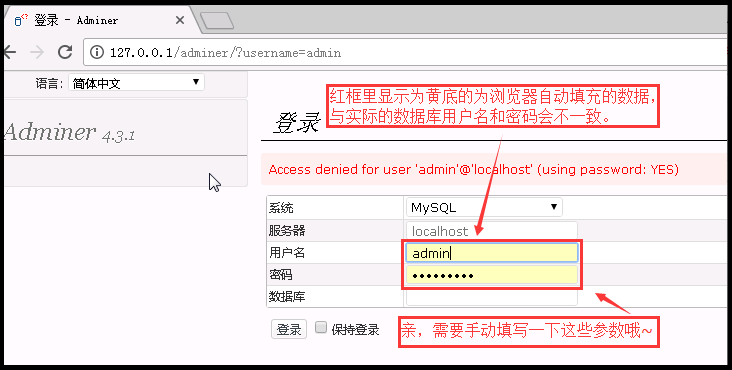 如果准备登录禅道数据库时,登录界面里显示为黄底的内容,是浏览器自动填充的数据。