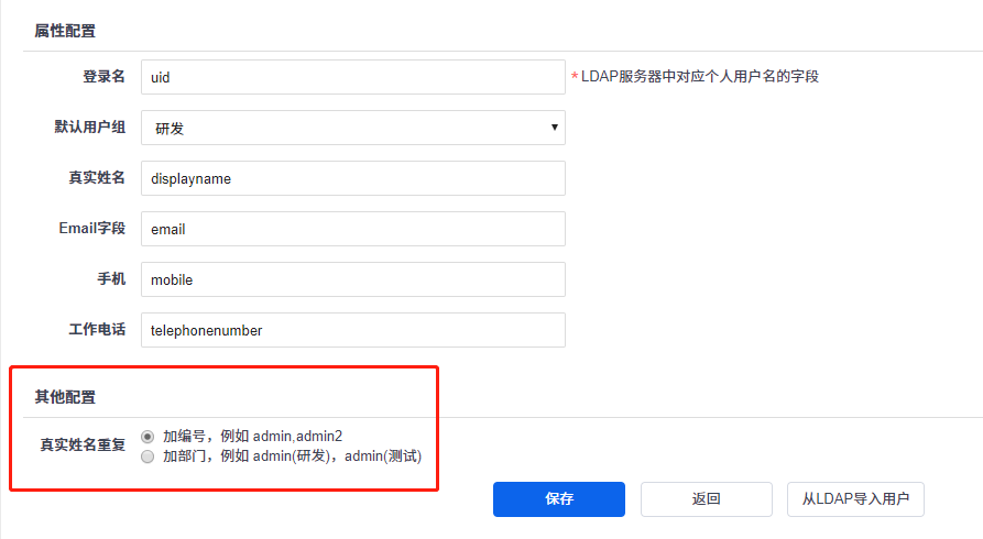 当从LDAP导入用户时,出现LDAP用户真实姓名和禅道系统用户真实姓名存在重名时,我们在配置LDAP时,可以有以下的区别显示: