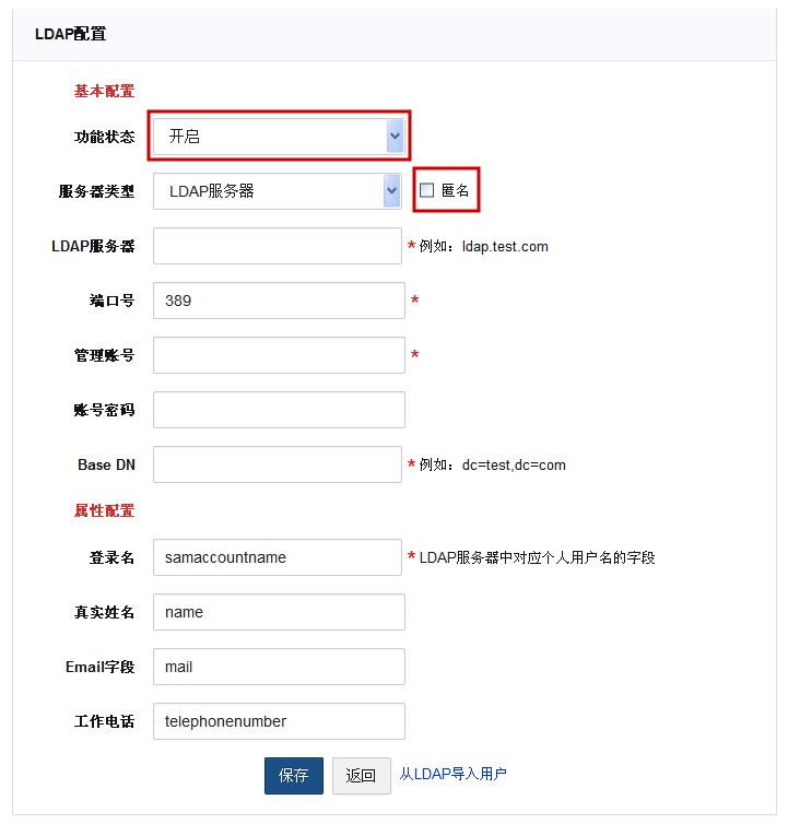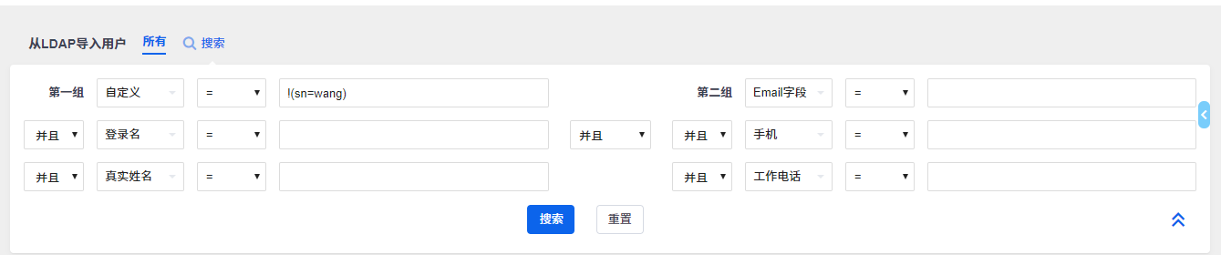 搜索条件除了可以搜索配置LDAP时,设置的属性配置:登录名、真实姓名、手机、工作电话、Email地址外,还提供了一个自定义的属性搜索。