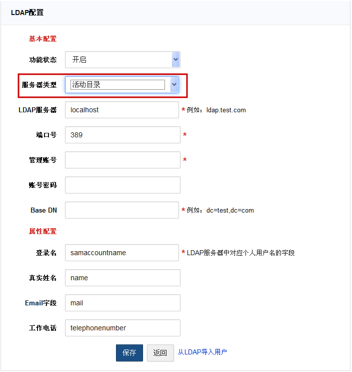 选择服务器类型为“活动目录”。因为活动目录不允许匿名登录所以需要填写管理账户和密码。