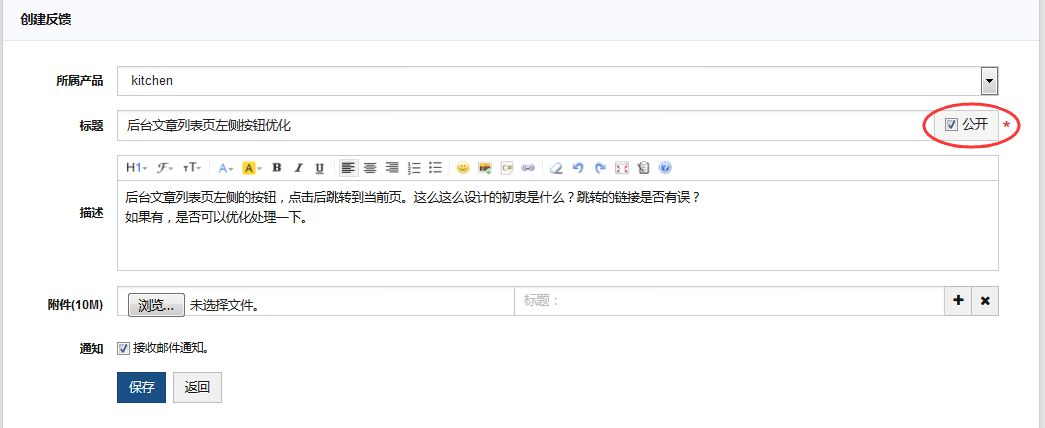 可以选择反馈内容所属的产品,禅道系统内所有的产品都会罗列在下拉菜单里。可以选择该反馈是否是公开的。