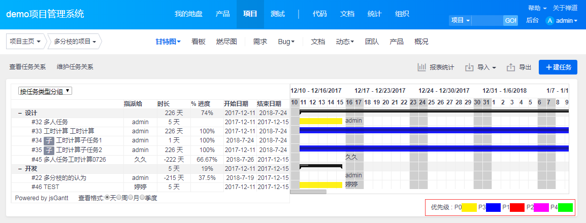 甘特图可以按照任务类型、指派给和需求进行分组。可以按照天、周、月或者季度显示。