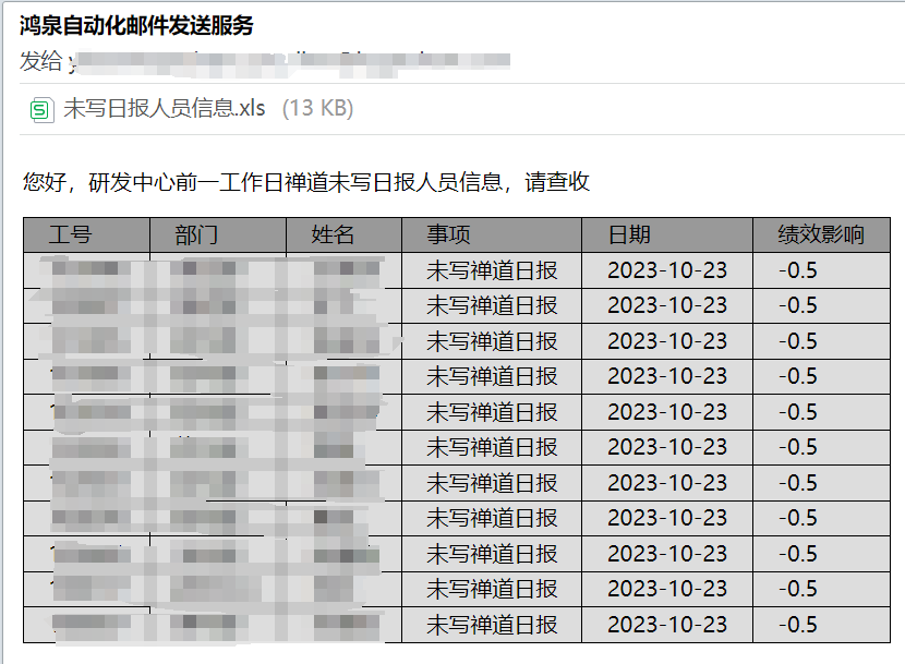 过程的监督也很有必要,我们在系统中做了一个检查报表,像一个自动巡查小机器人一样,它每天都会去巡查大家日志和工时的填写情况,是否填写,以及是否填写到对应的项目中了,会抓出填写不规范的名单以邮件的形式做一个晾晒。