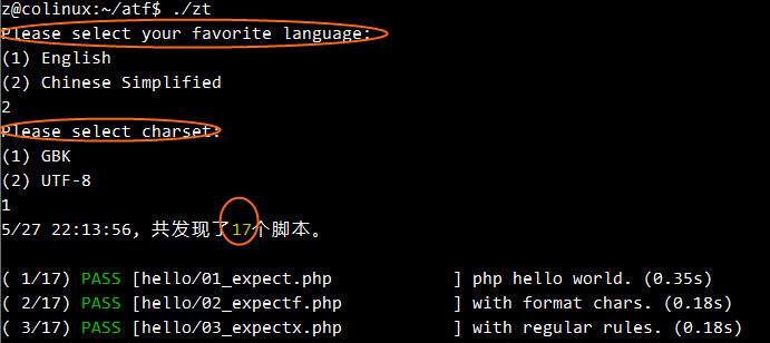 当首次执行的时候,zt脚本会提示你选择喜欢的语言,如果是中文的话,还可以选择适用的编码。当选好之后,后面的语言提示就使用中文了。
