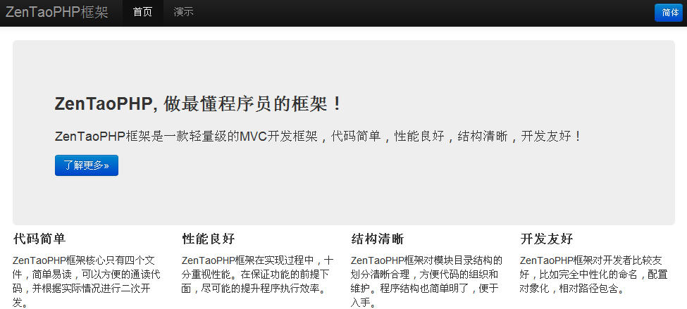 大家好,我们非常高兴的向您宣布,禅道php框架2.2版本发布了。该版本主要调整了框架的目录结构,并使用bootstrap重写了框架示例的代码。欢迎大家下载使用。