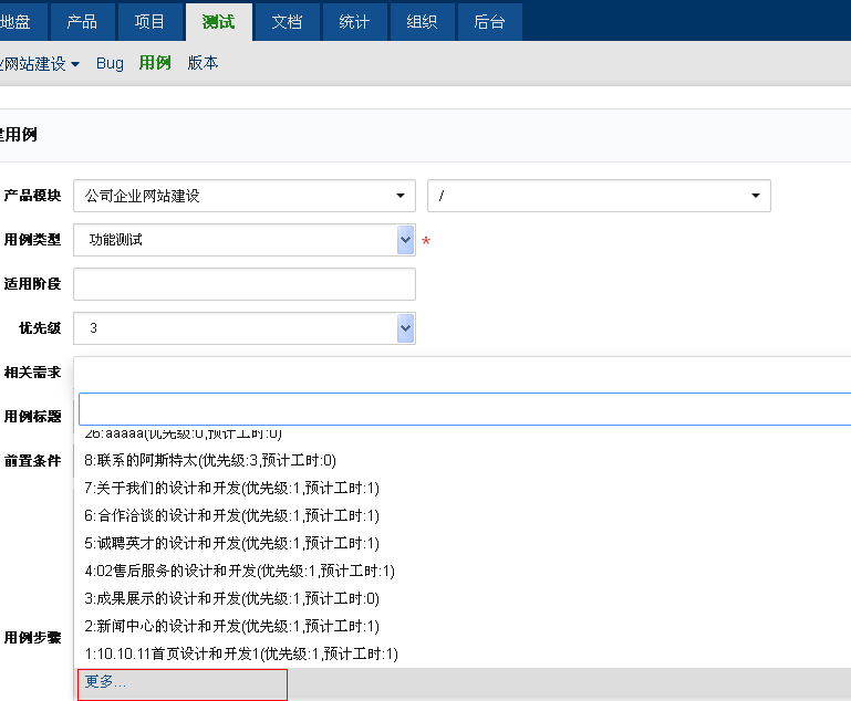 5、创建用例时相关需求列出非关闭的需求。创建用例列出50条需求,多于50条可以通过更多来搜索。