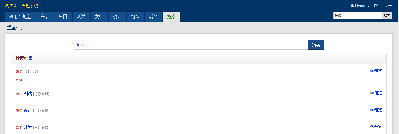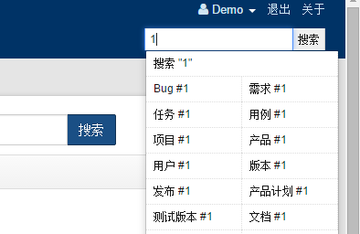 3、全文检索功能集成到了禅道右上角的快捷搜索。当然原来的功能也是可以用的。