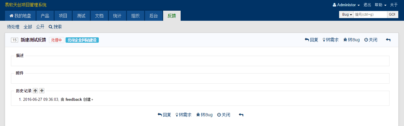 反馈详情,可以回复该反馈,也可以将反馈转需求、转任务。