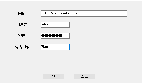 3) 在站点编辑页面,按照提示填写正确的禅道网址及用户名和密码。点击添加,即可关联禅道。