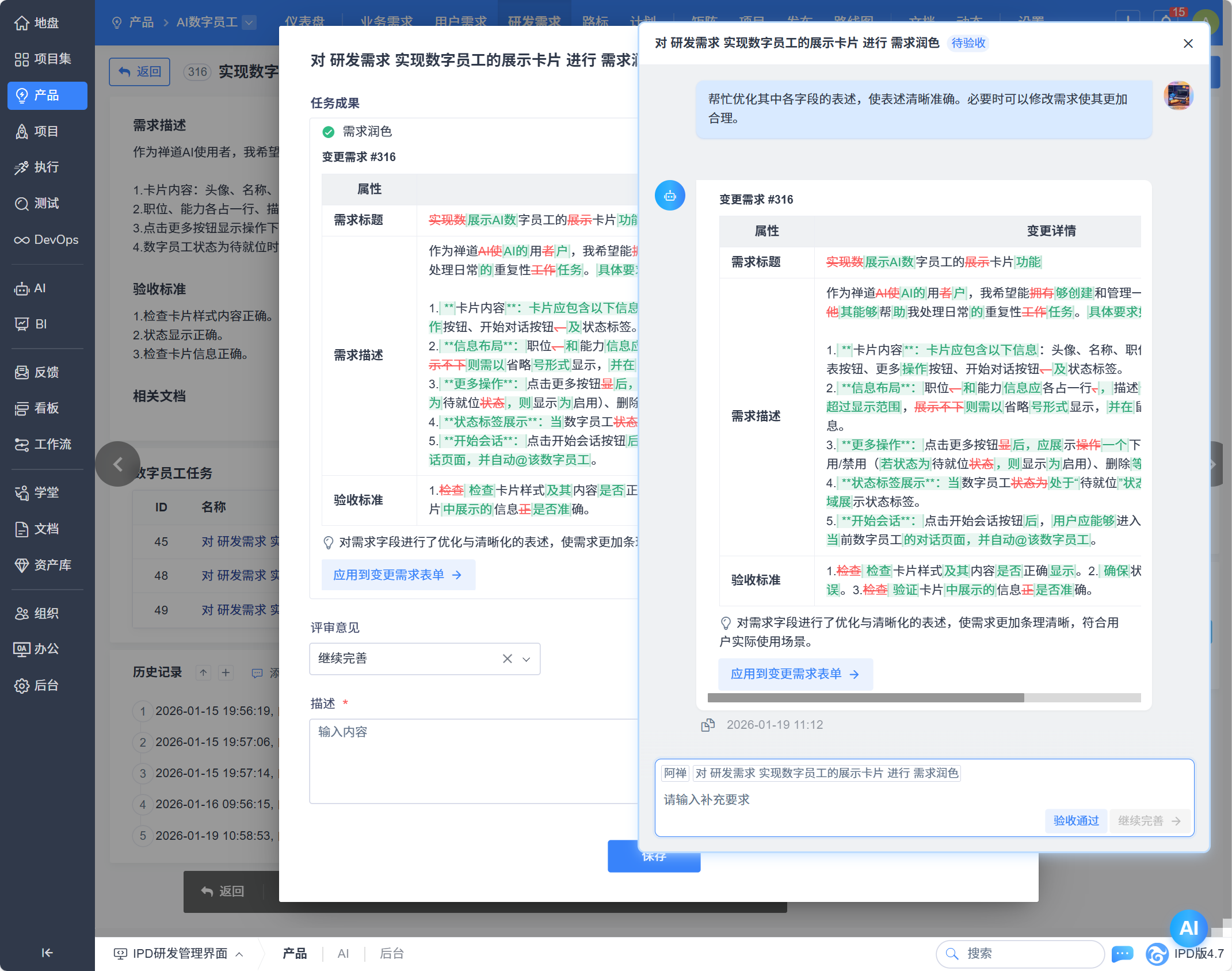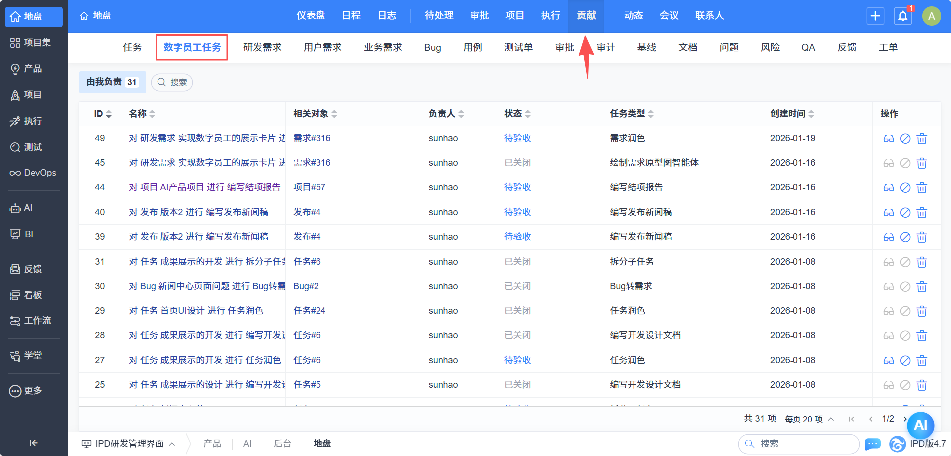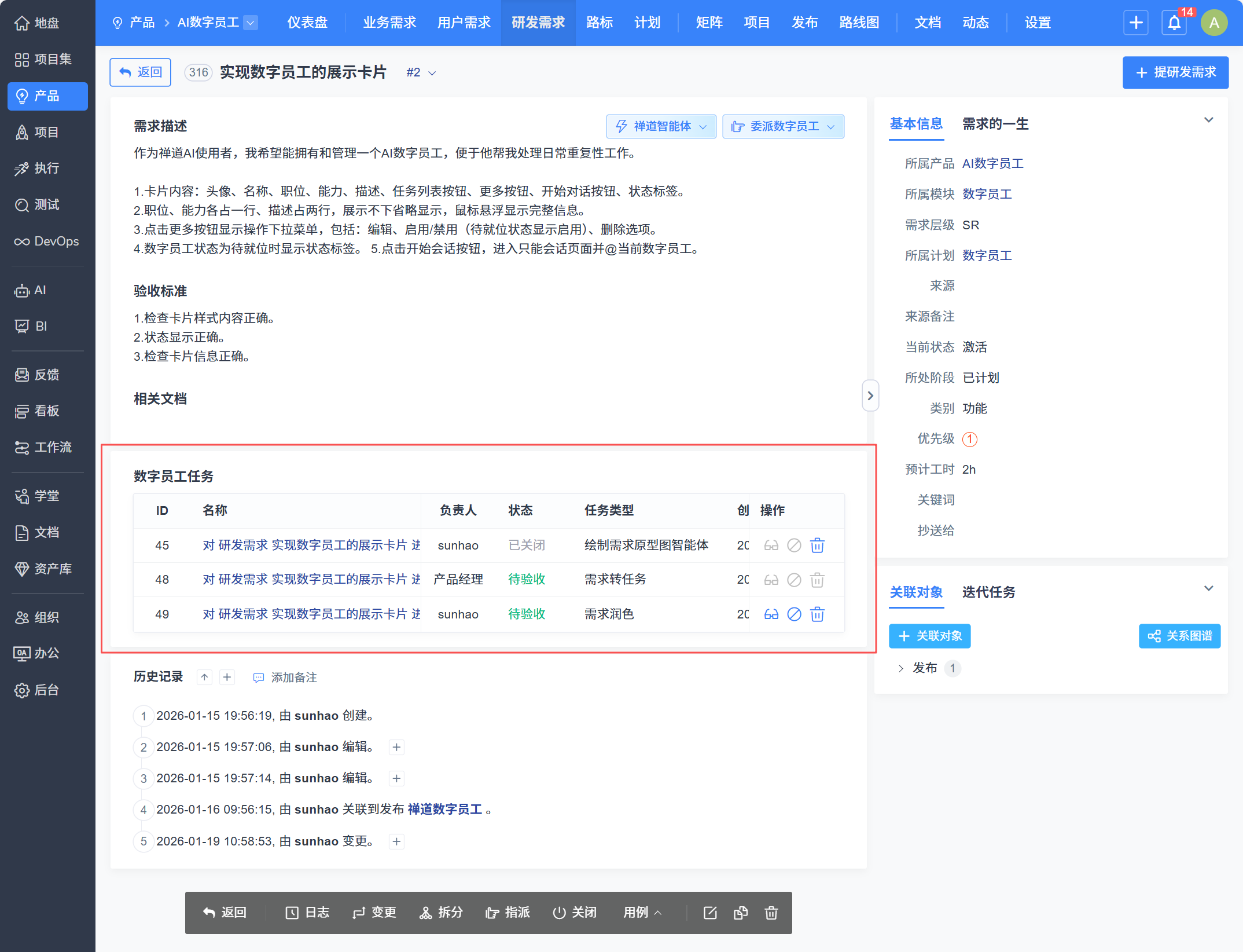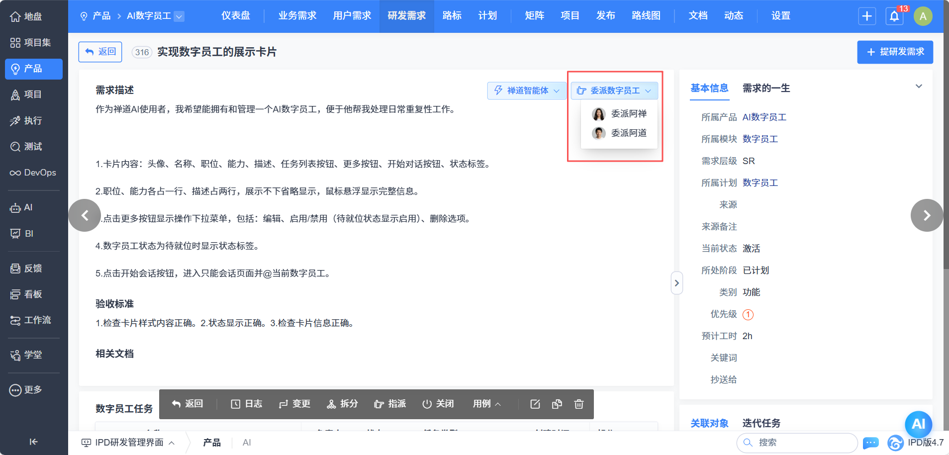 - 数字员工任务委派:在需求、任务、Bug、用例、计划等详情页面,可直接委托数字员工执行AI任务,实现流程自动化。