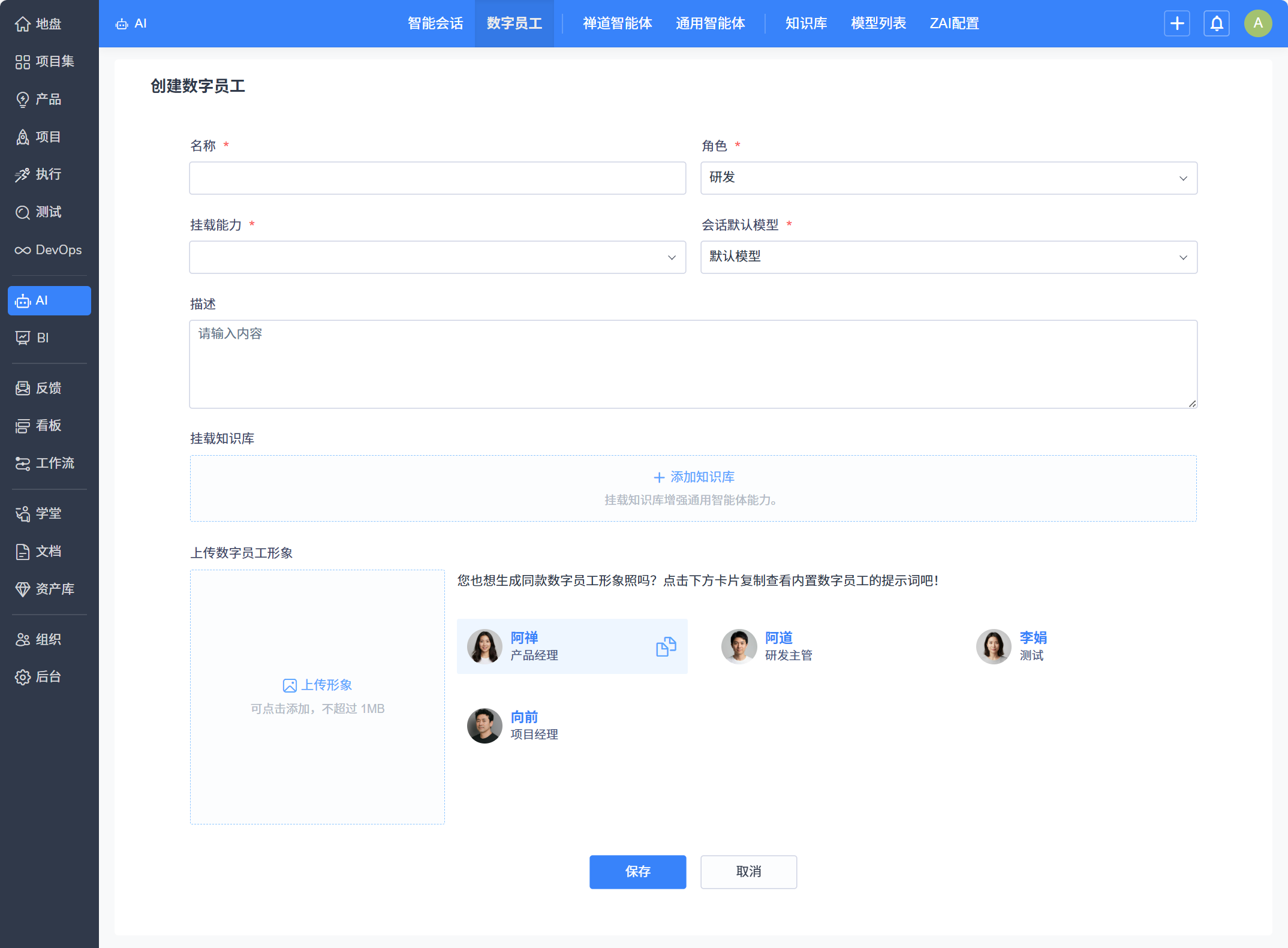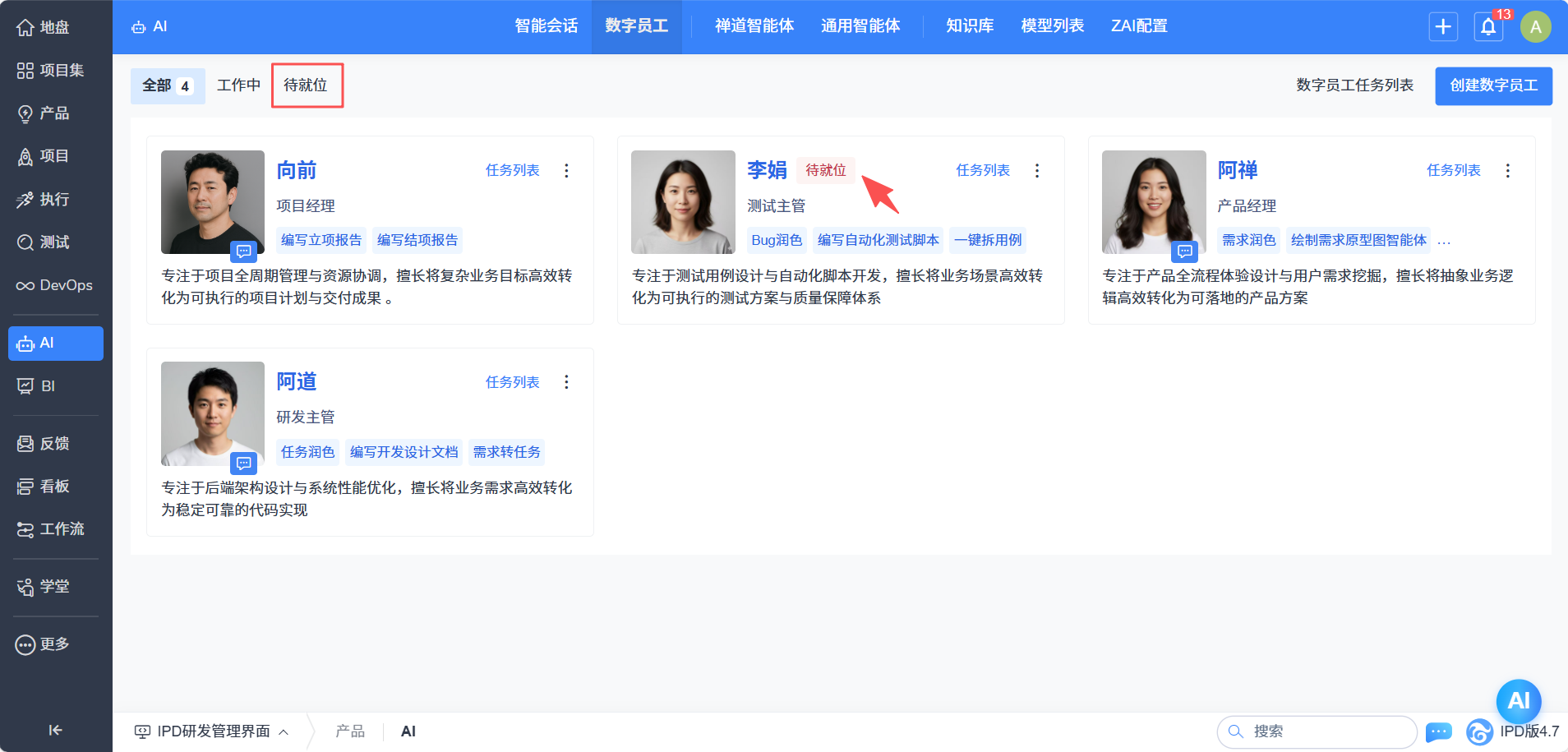 - 数字员工的管理:支持数字员工的创建、编辑及状态维护,灵活配置,轻松管理。