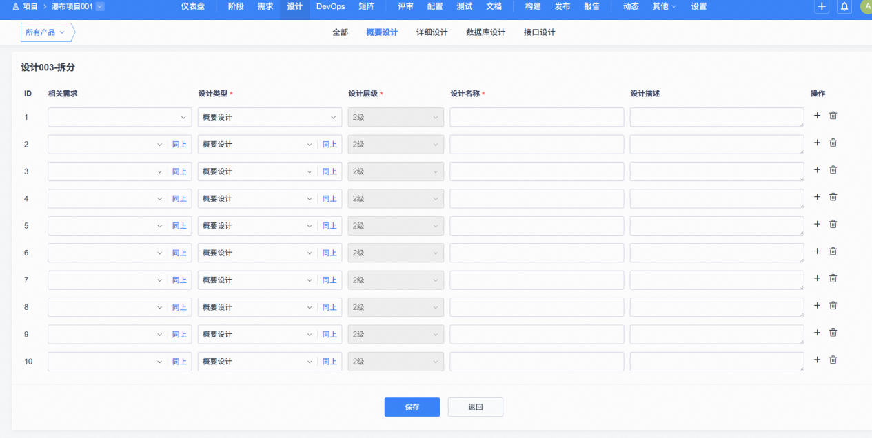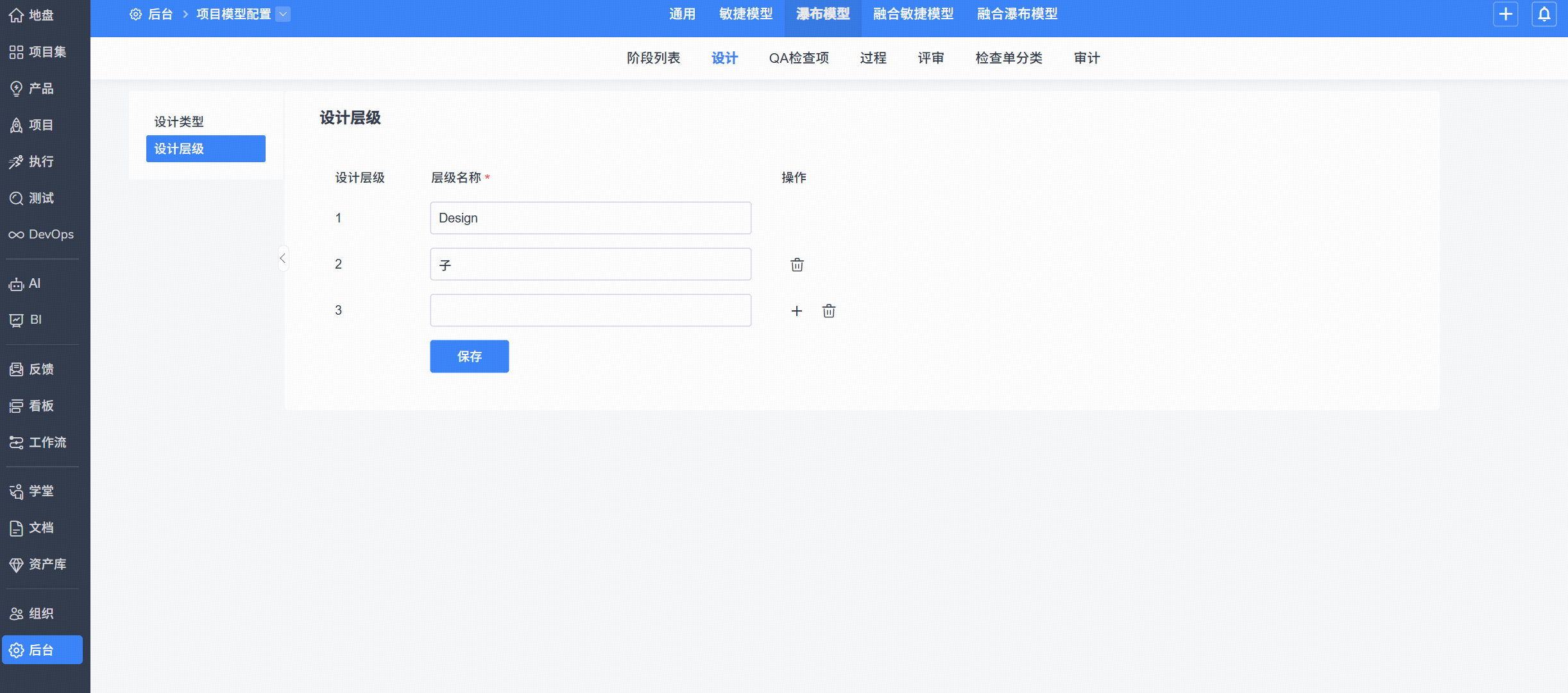 2、支持【后台-项目模型配置】中对瀑布模型/融合瀑布模型中的设计层级进行自定义拓展。