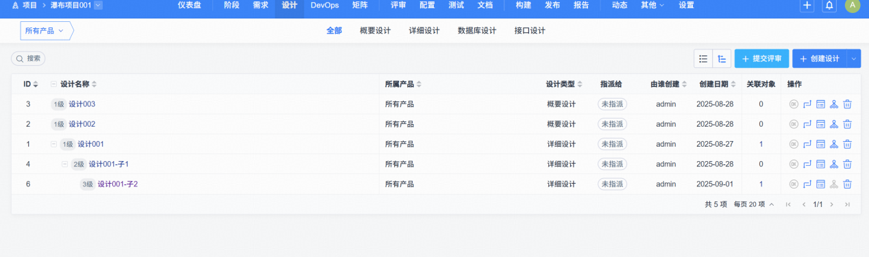3、设计列表支持按照设置层级拆解细分设计,并支持按照树形结构展示。