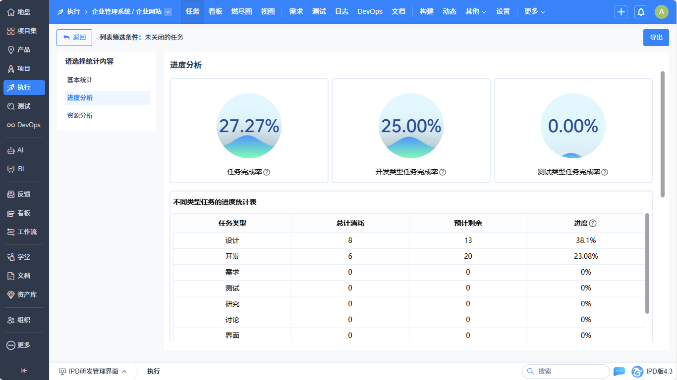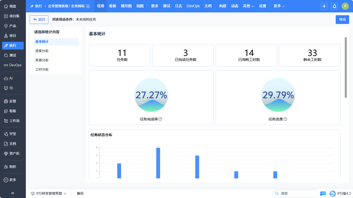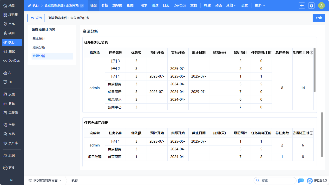▼执行-任务列表实现基本统计、进度分析、资源分析的统计优化。