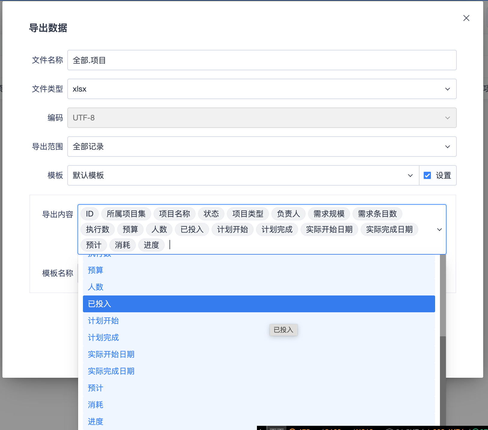 ▼项目导出数据页面支持设置模板功能