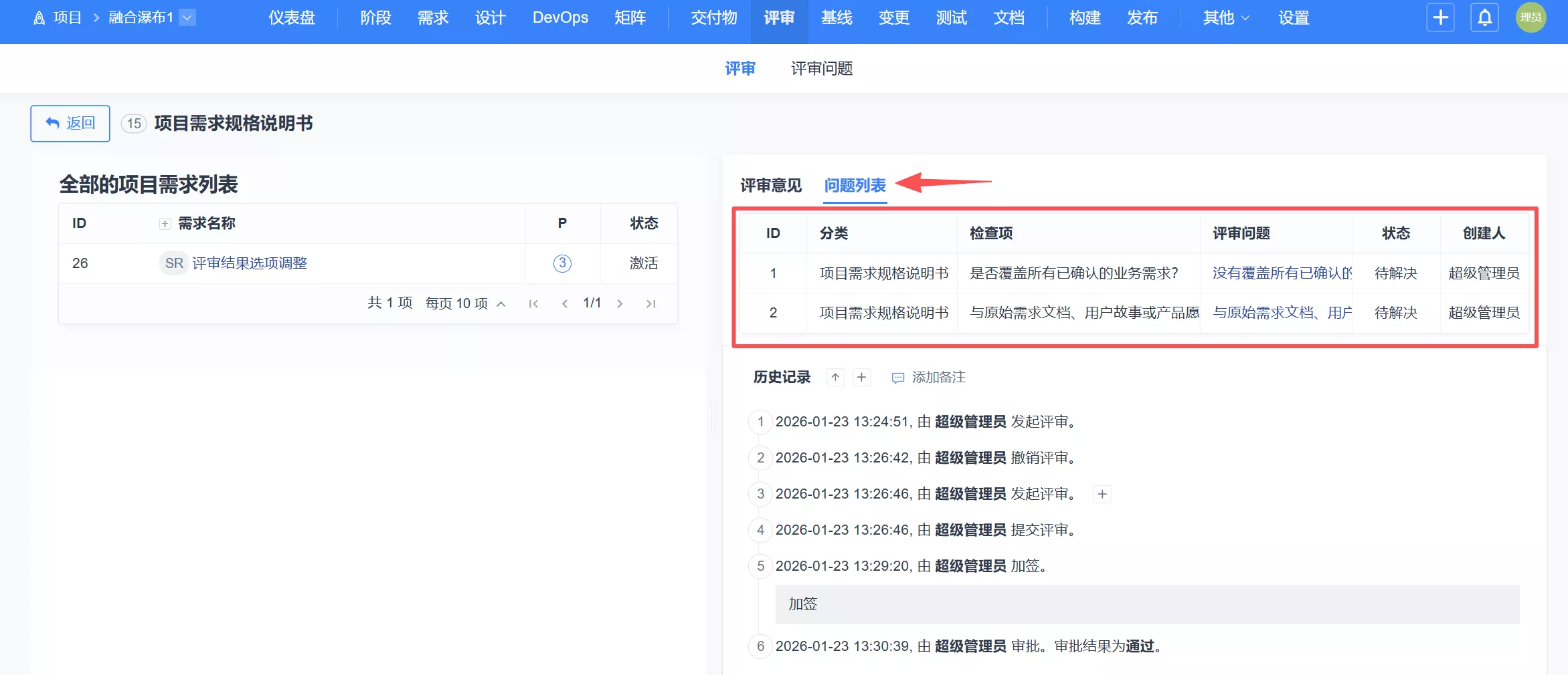 ▼评审时,支持查看此前所有节点评审人提交的评审问题。