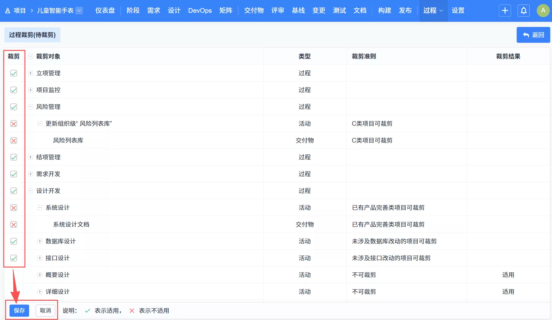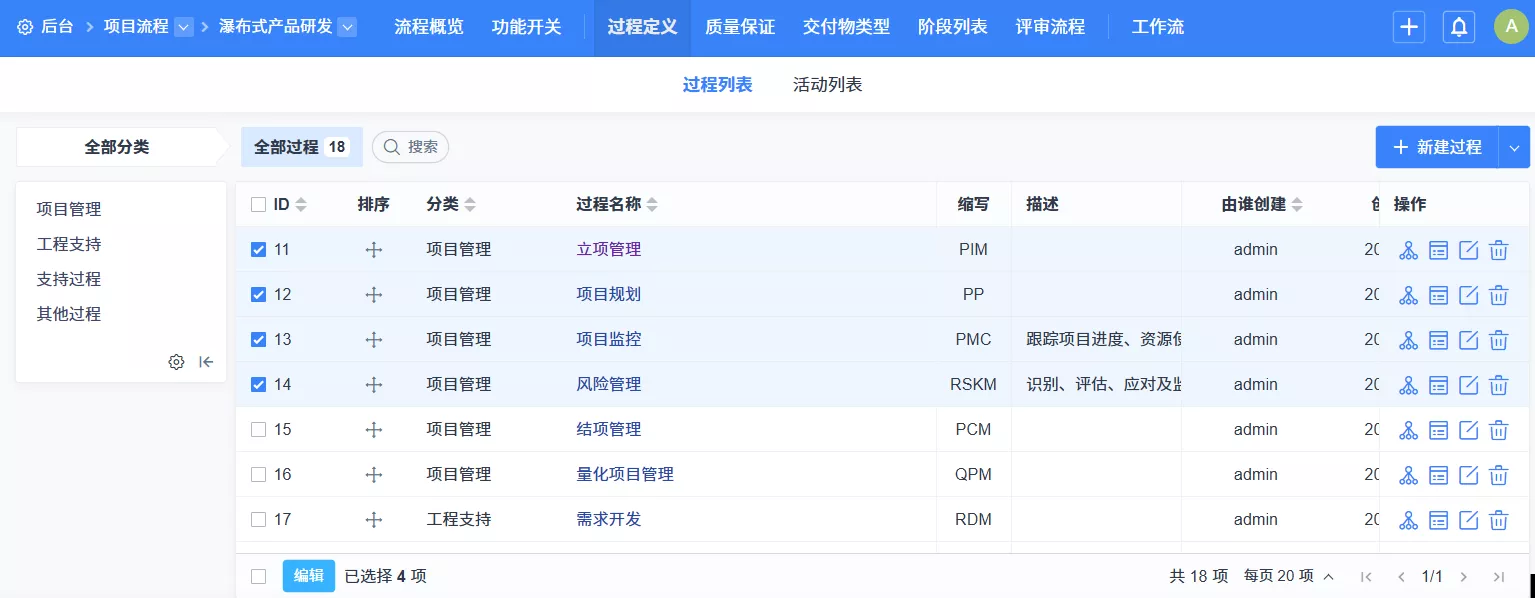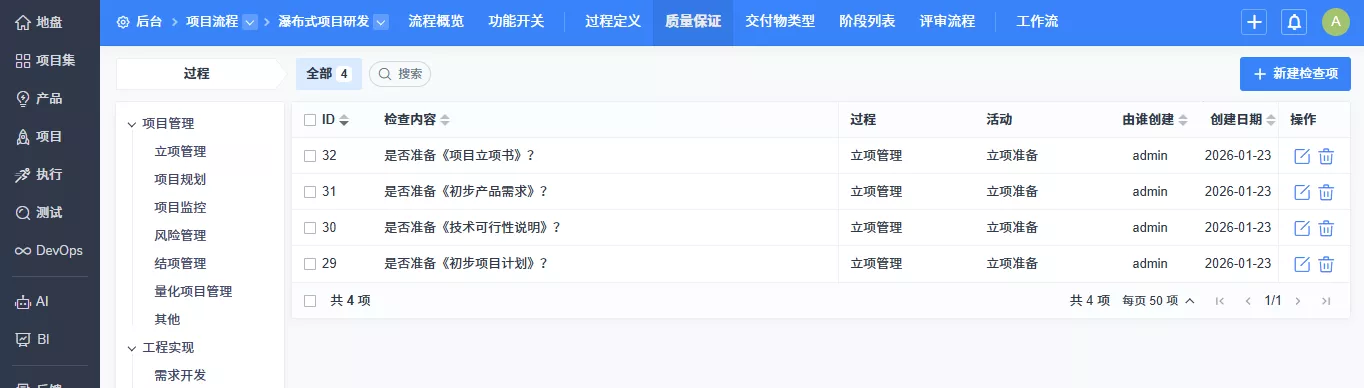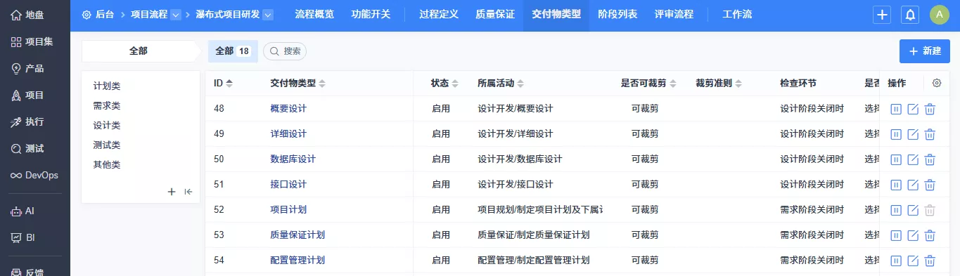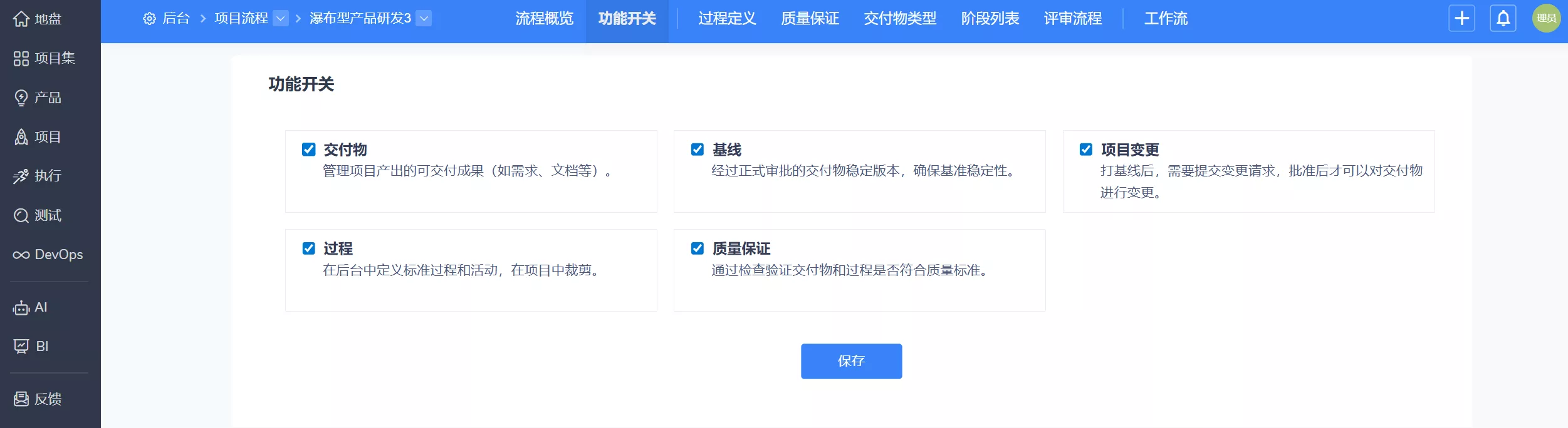 ▼项目流程中支持功能开关,可以独立开启交付物、过程、质量保证、基线、变更功能。