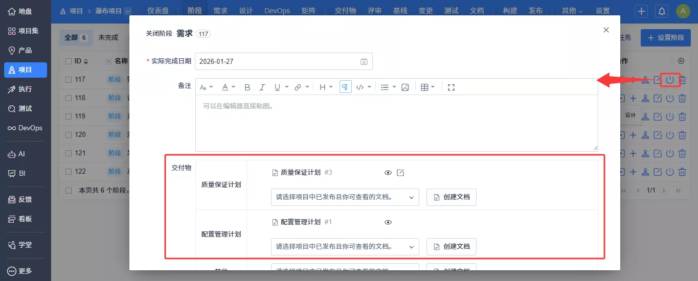 ▼在阶段关闭和项目关闭时,系统会根据后台预先配置的交付物校验规则,自动检查相关交付物是否已按要求提交;如有未提交的交付物,则无法完成阶段或项目的关闭操作。