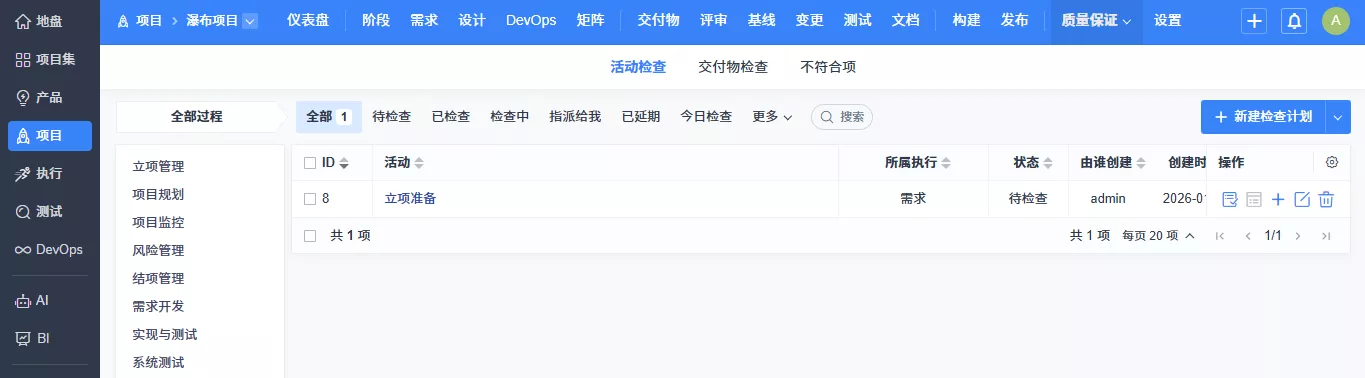▼质量保证支持为活动配置检查项,前台项目可据此制定检查计划,规范活动执行过程中的质量检查与跟踪。