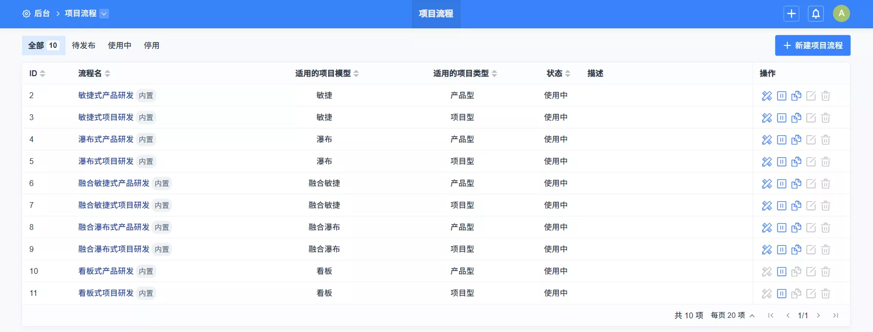 ▼内置项目流程细分为10个,且内置项目流程支持启用停用。