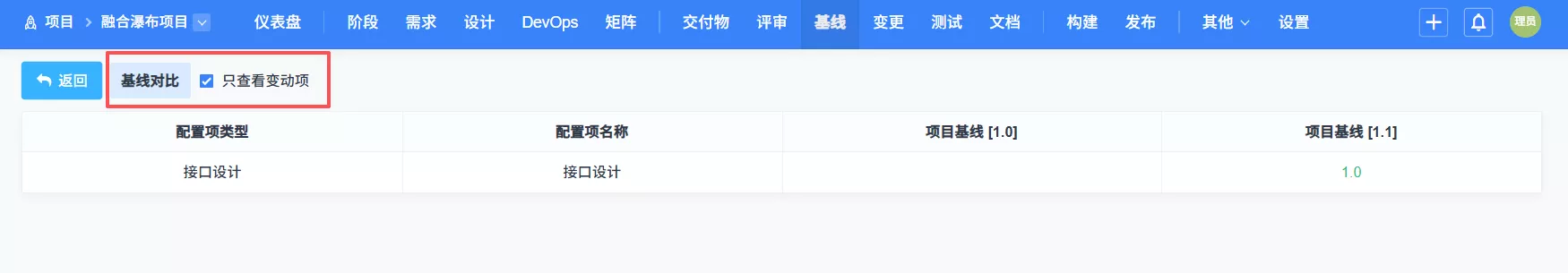 ▼评审通过的交付物可以一起打基线,打完基线后可以和上次的基线进行比对,快速了解新基线的变化内容。
