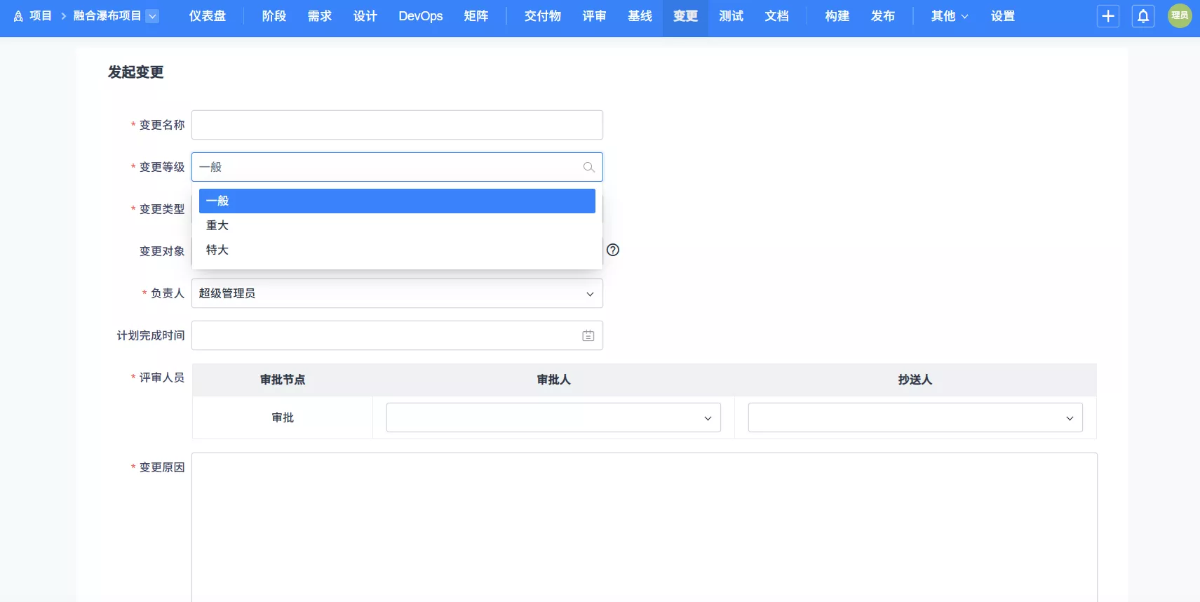 ▼瀑布项目/融合瀑布项目下新增项目变更功能,打基线的项目内容变更时须经过评审,评审通过后才可变更。