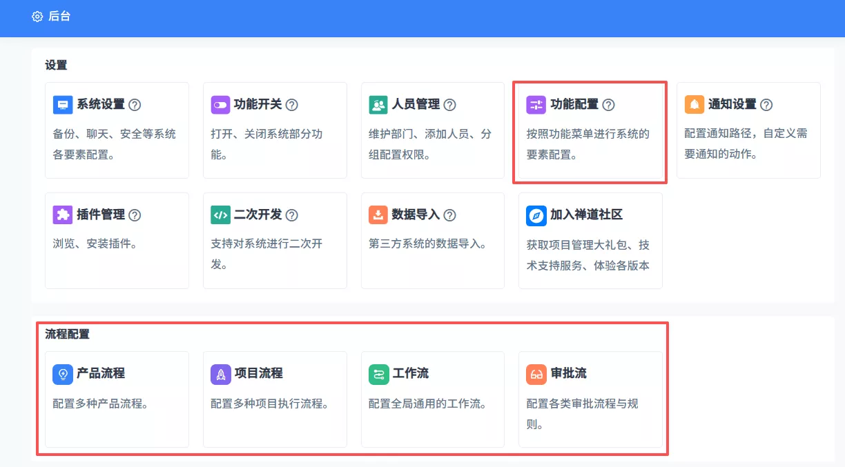 ▼后台项目模型配置合并到功能配置,项目流程设置、工作流、审批流菜单移动到后台。