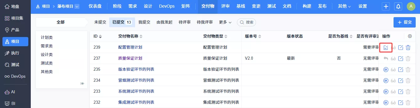 ▼在项目交付物管理中,既可以将内置交付物类型的数据提交为交付物,也可以将项目过程中形成的各类文档提交为交付物。提交后,可对交付物发起评审,评审通过后会生成交付物版本号。