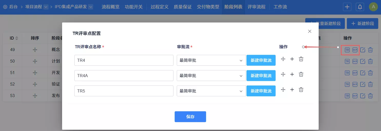 ▼ 后台新增自定义IPD项目的TR和DCP评审点,以适配企业IPD项目项目的评审要求。