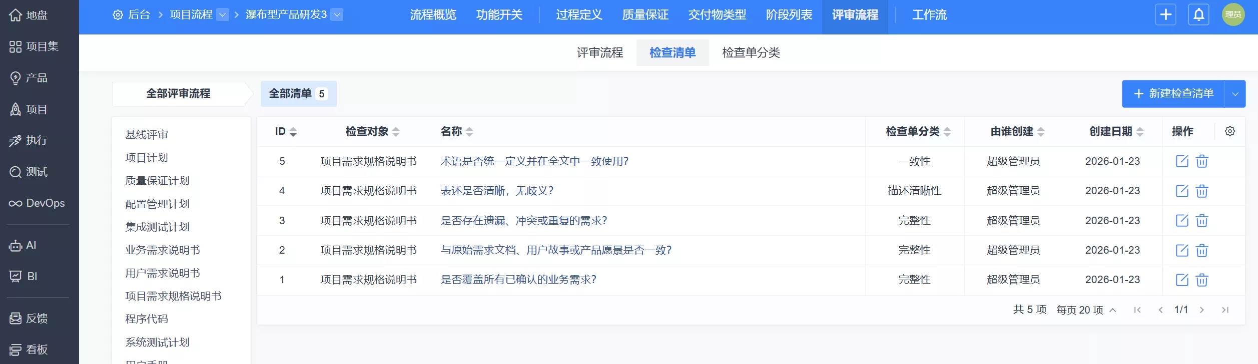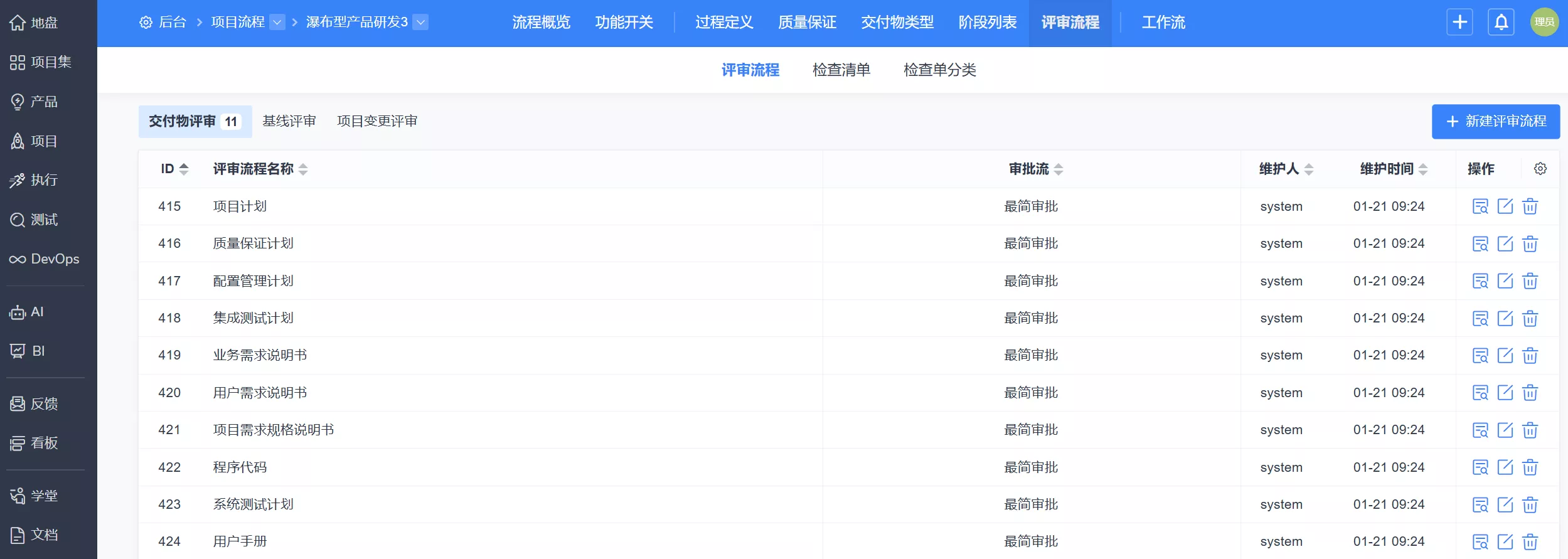 ▼评审流程支持设置项目内交付物、基线、变更的评审流程,以及评审时的检查清单。