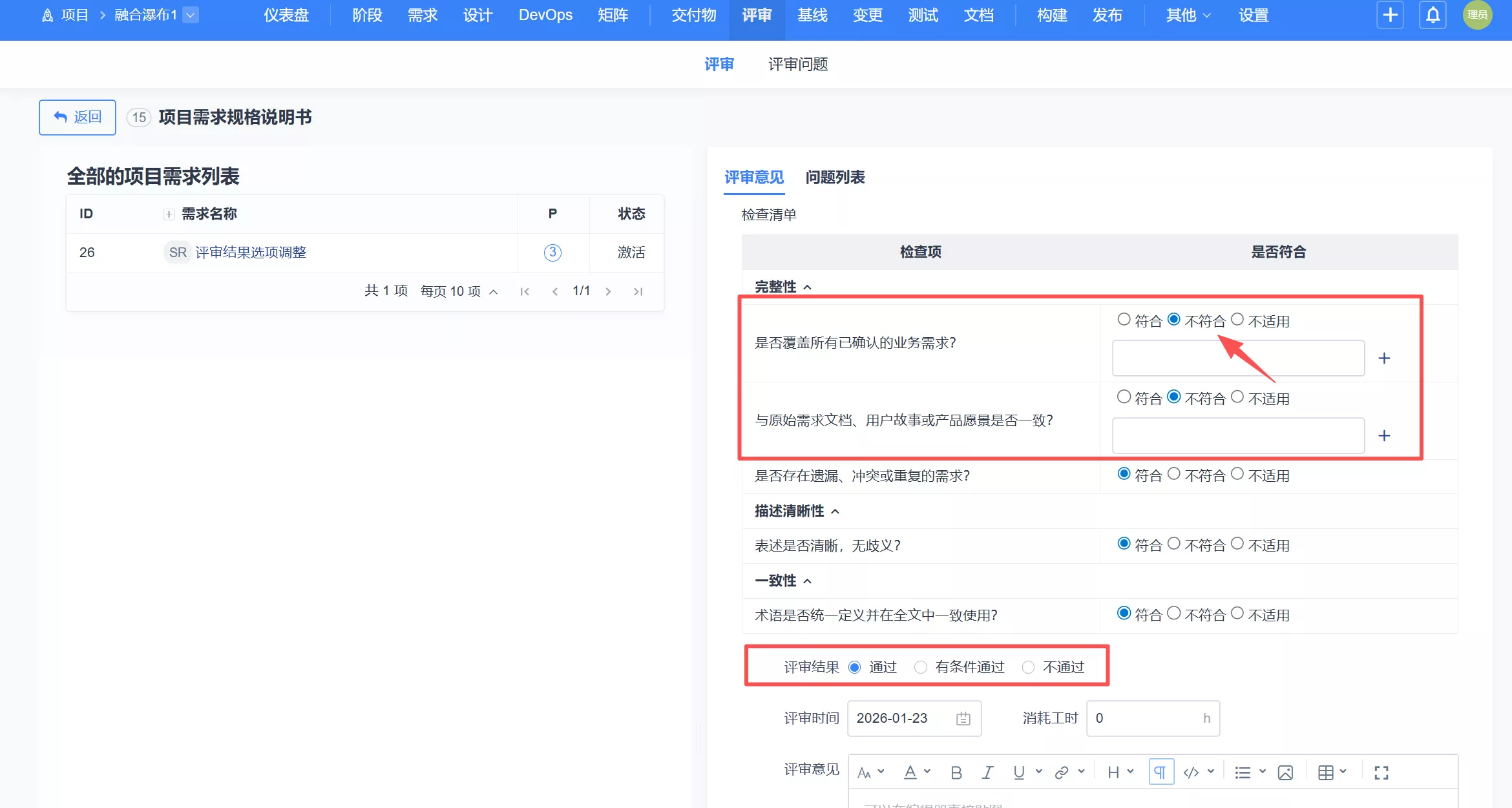 ▼评审时,右侧检查清单增加不适用选项。同一检查项可以提交多条问题。评审结果增加有条件通过,选择后流程可以正常流转到下一节点。