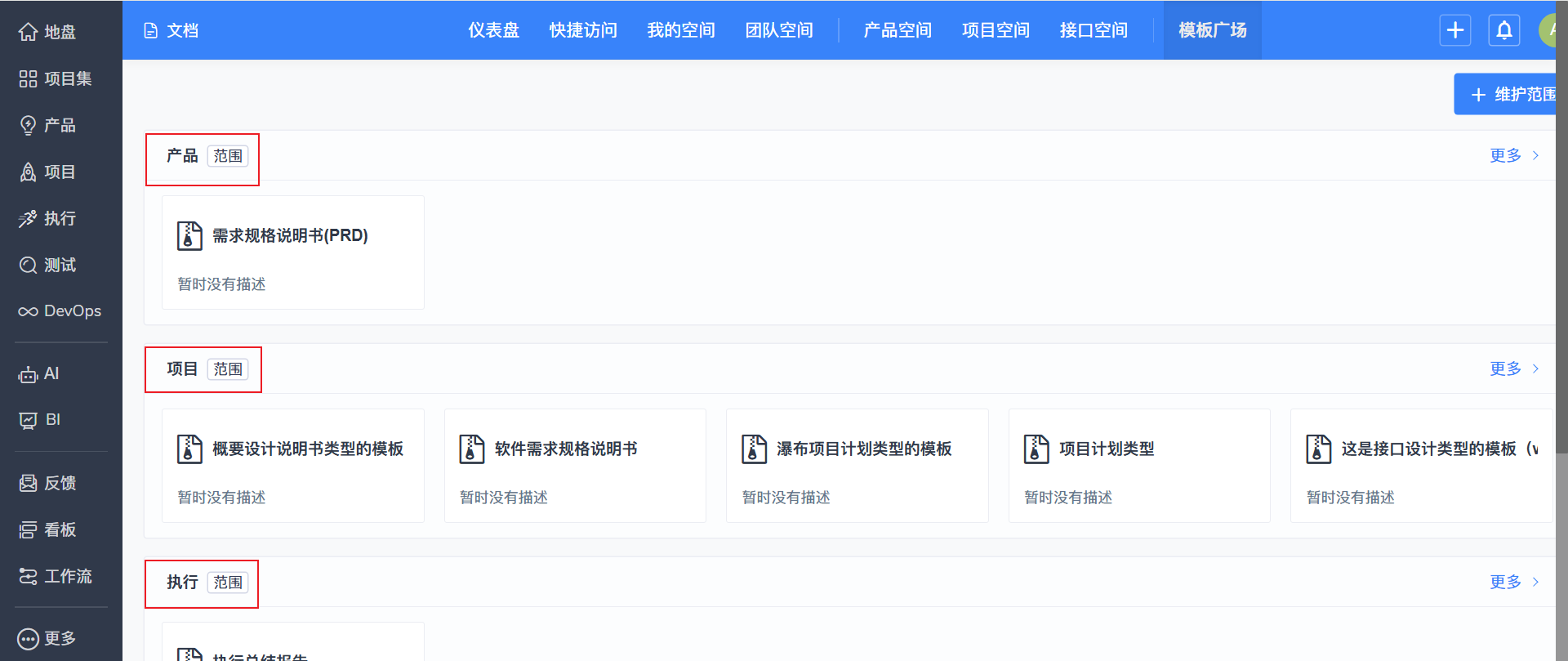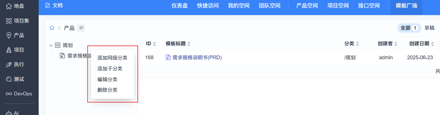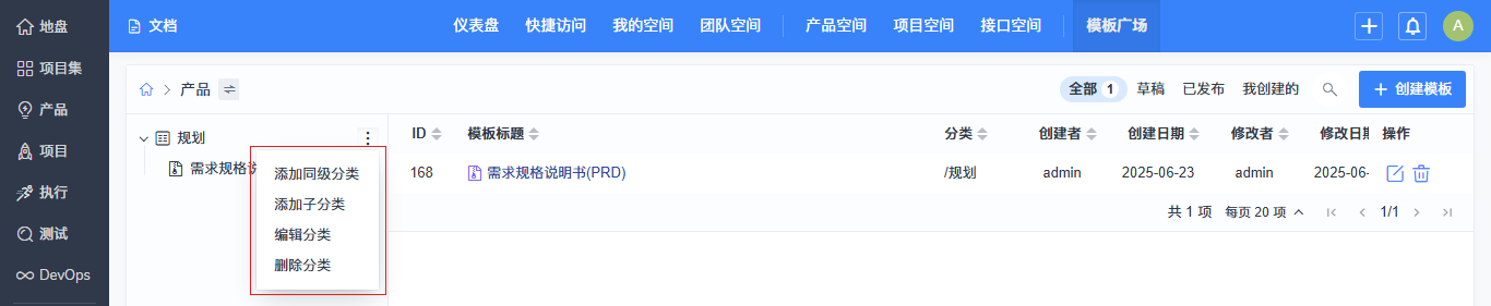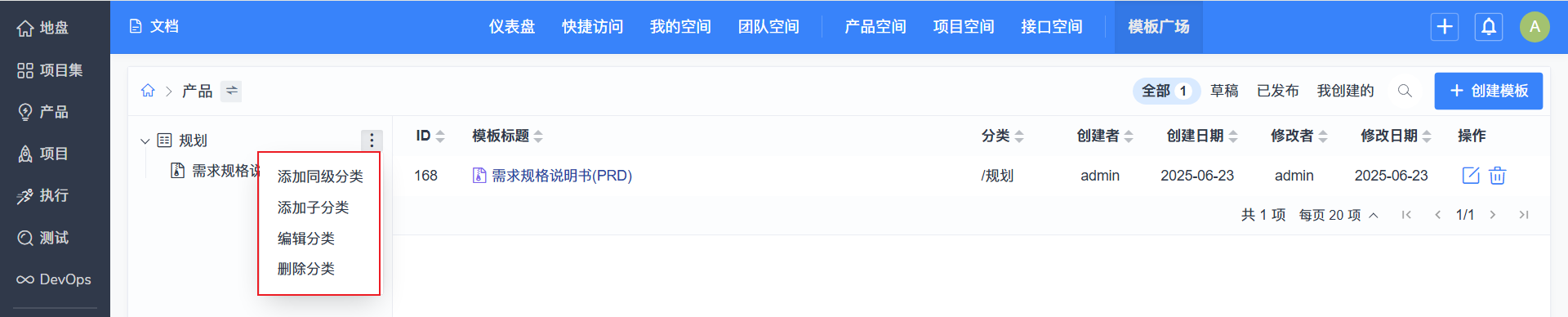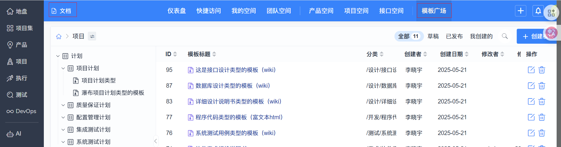 ▼文档二级菜单增加模板广场,将原后台的文档模板移至文档模块的模板广场中。