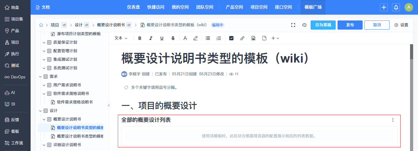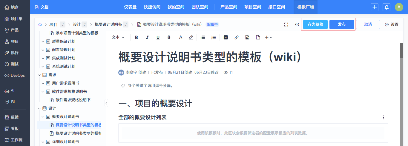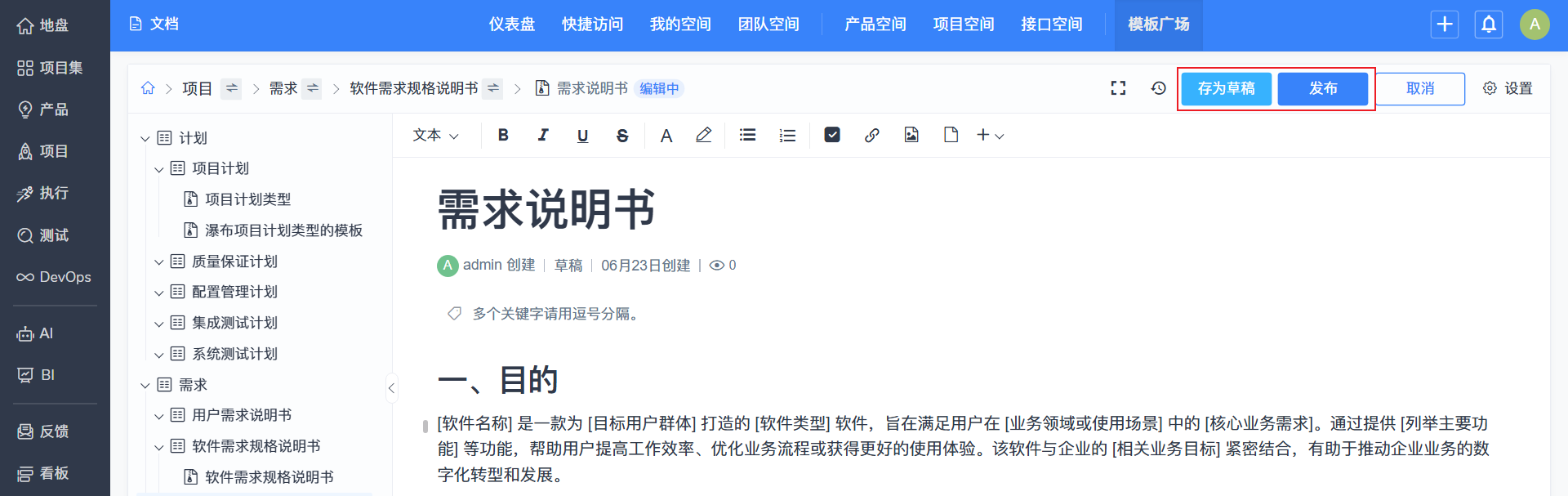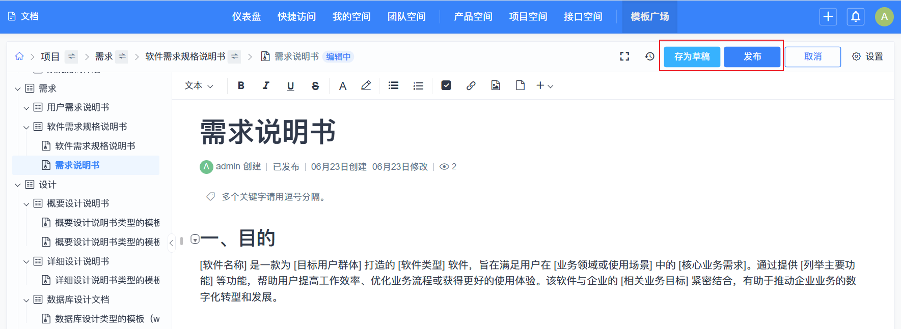 ▼创建文档模板时,支持存为草稿或发布。草稿态的模板仅创建者可见,不可使用,发布后的模板才能被其他有权限的人查看和使用。