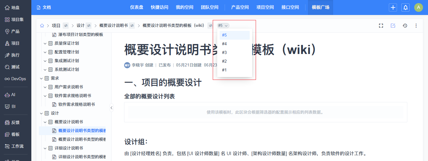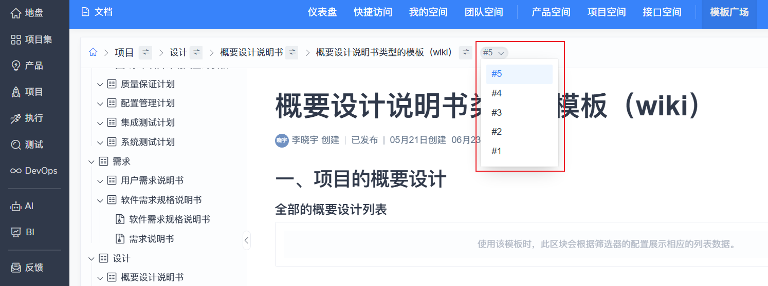 ▼文档模板实现版本管理功能,可以切换版本查看历史版本的模板内容。