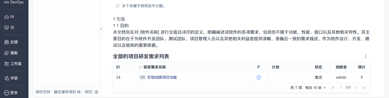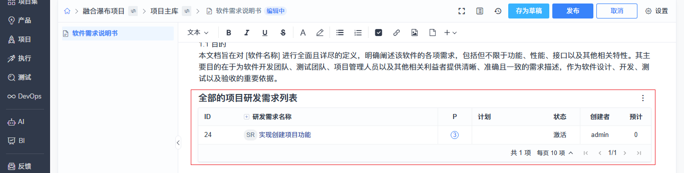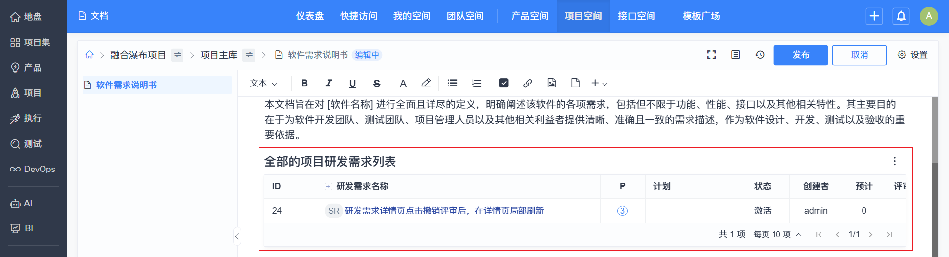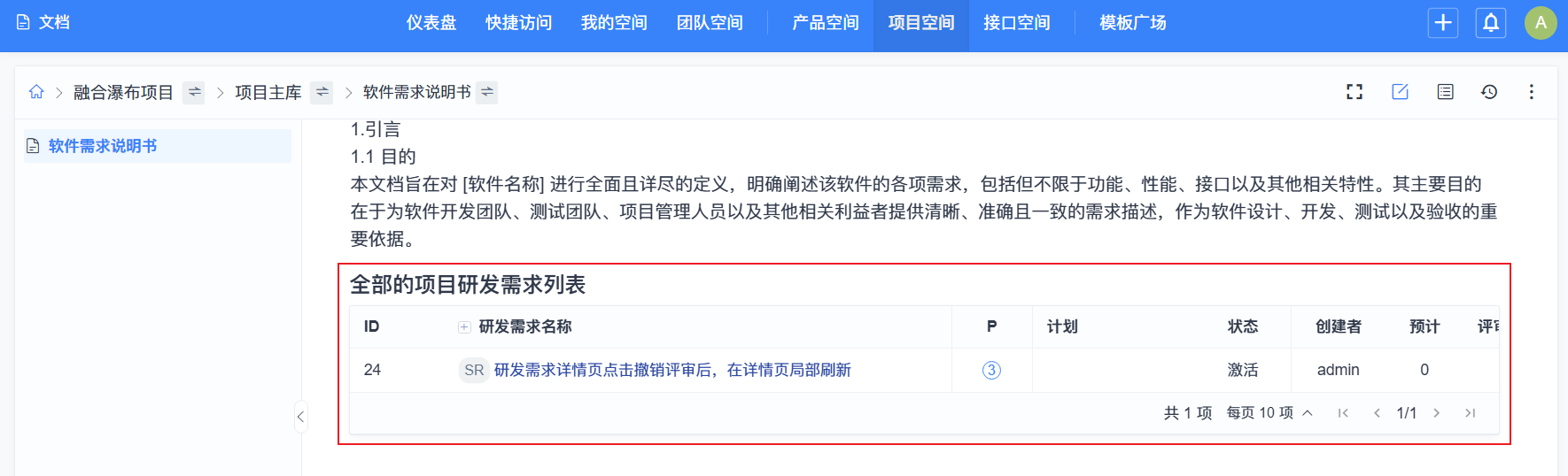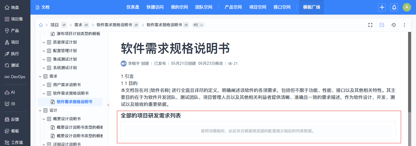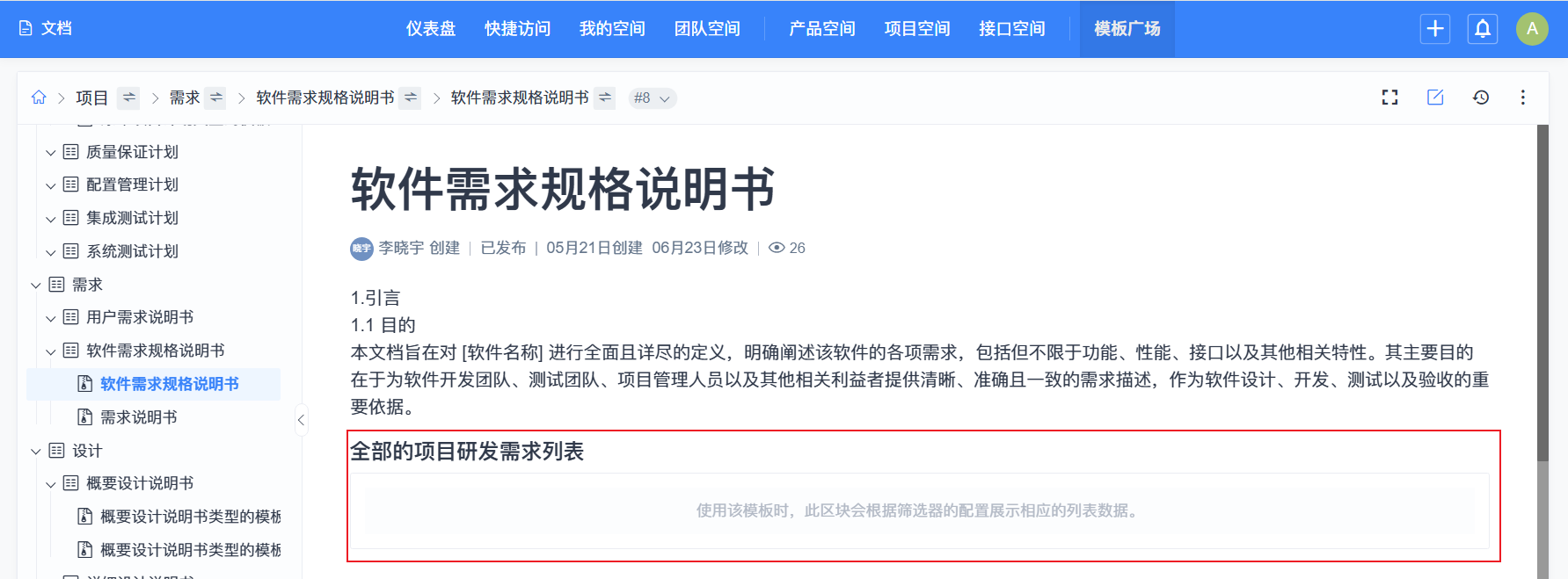 ▼文档中插入研发需求、业务需求、用户需求和用例列表时记录版本号,查看数据详情展示的是插入时的版本内容。