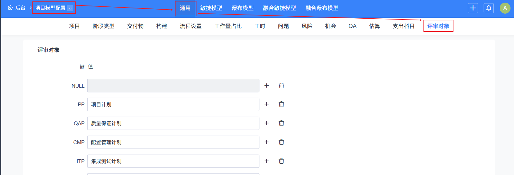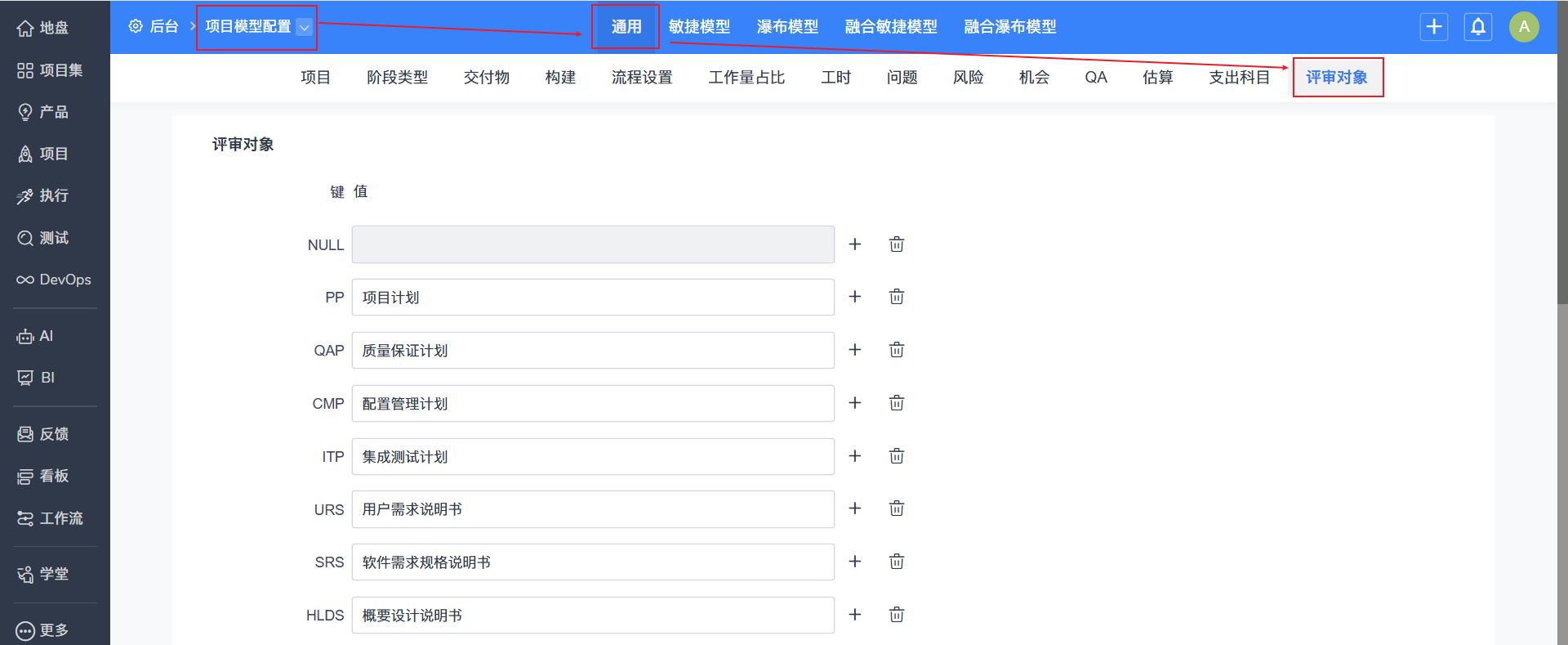 ▼文档模板类型和项目评审对象解绑,评审对象的维护入口放在后台项目模型的通用配置中。