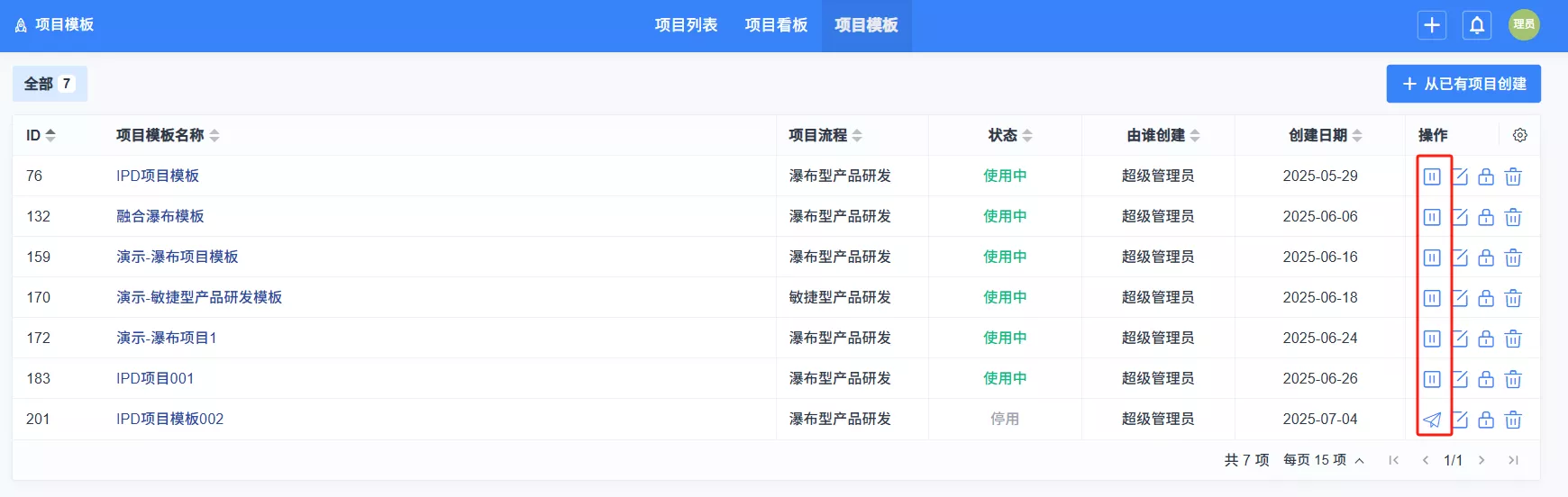 ▼项目模板新增「发布」「停用」功能,只有发布后的项目模板才可以使用。