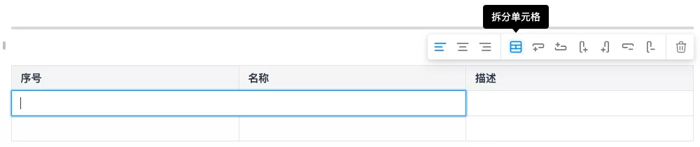 ▼文档新编辑器中插入的简单表格支持拆分单元格。
