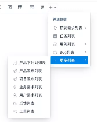 ▼在文档顶部工具栏的更多下拉菜单中增加了插入禅道数据入口。