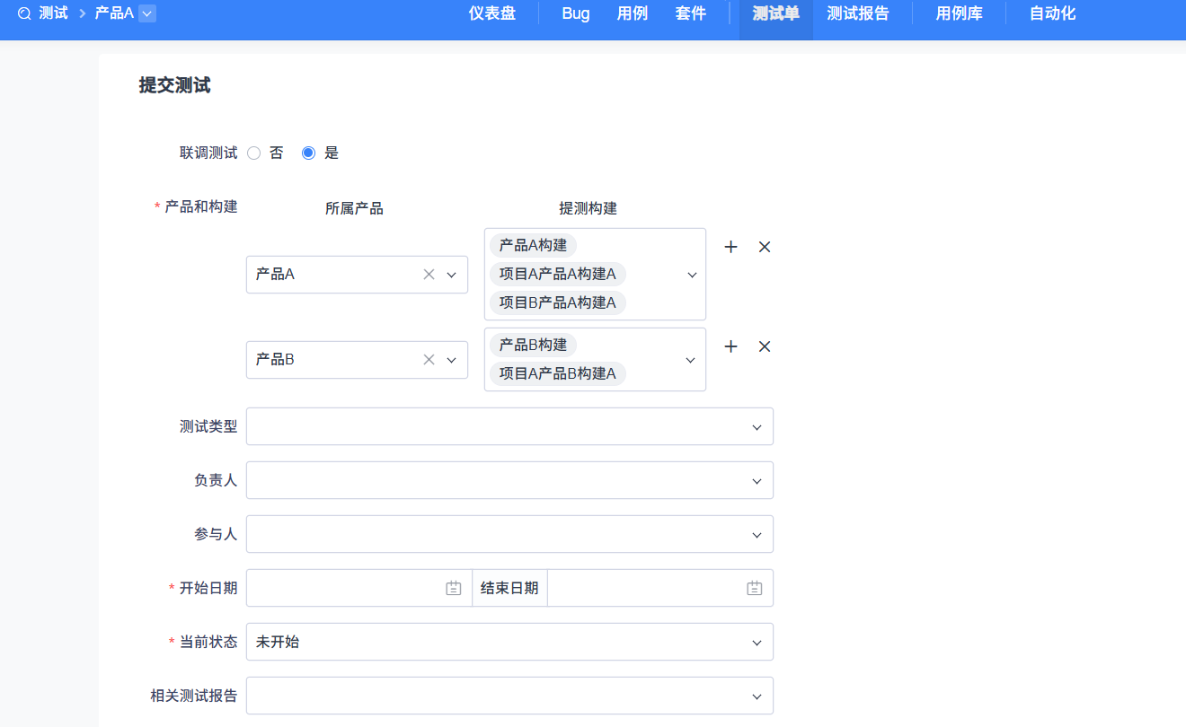 ▼提交测试单时,如果选择联调测试,可以选择多个产品下的构建一起进行提测。