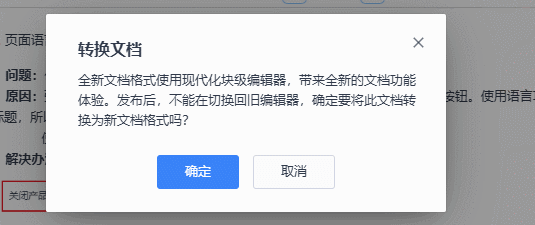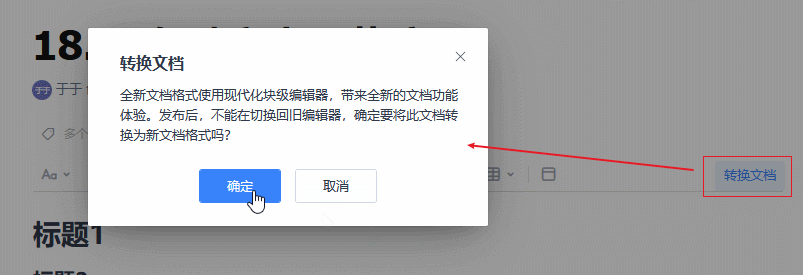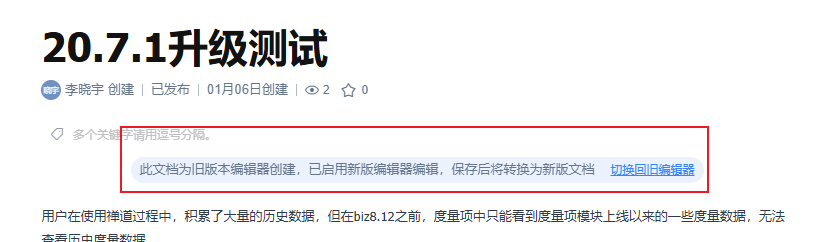 ▼未完成自动升级的历史文档,在编辑文档时可手动升级为新版编辑器格式,同时在未发布该文档时可撤销升级(草稿状态的历史文档需手动升级)。