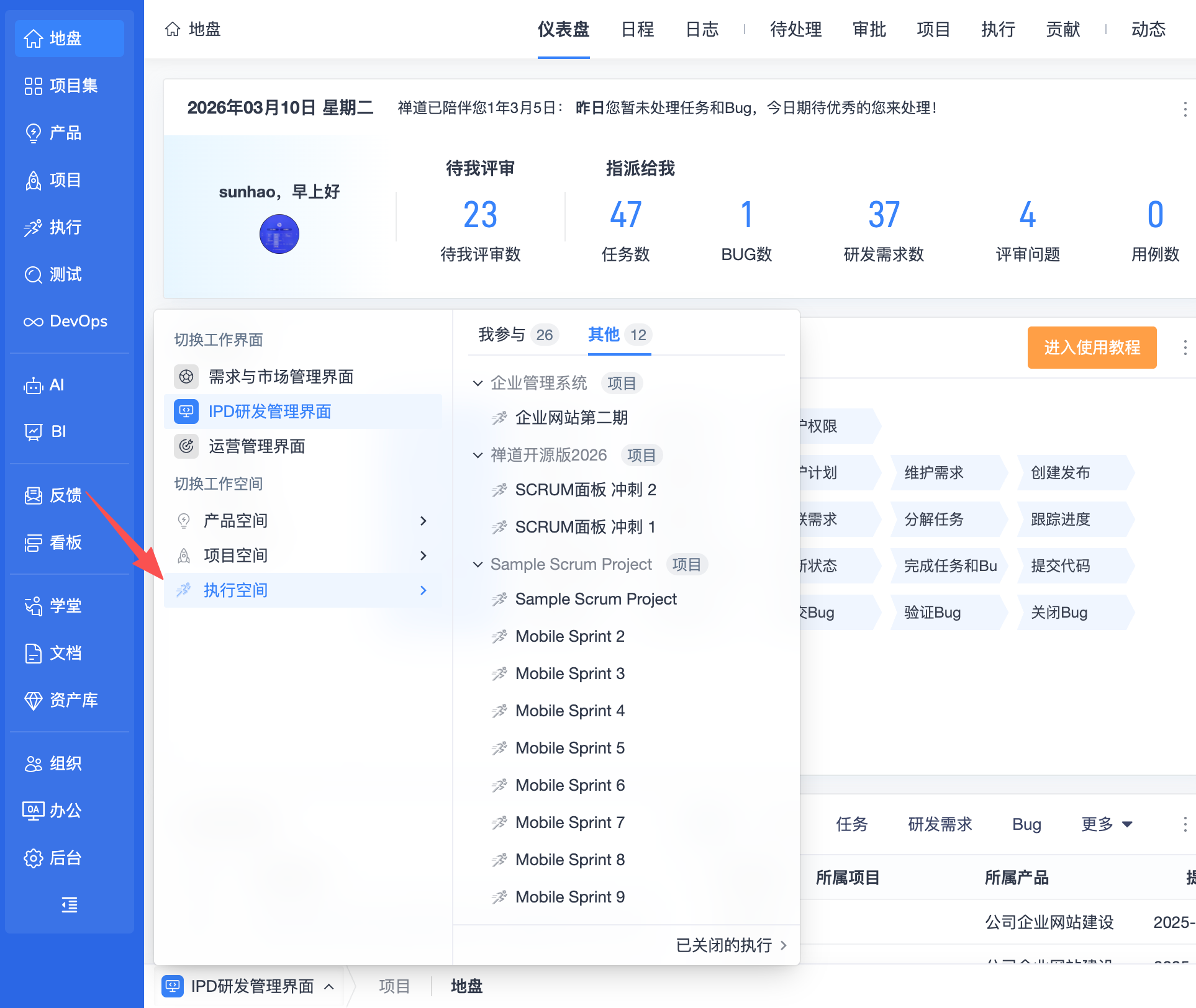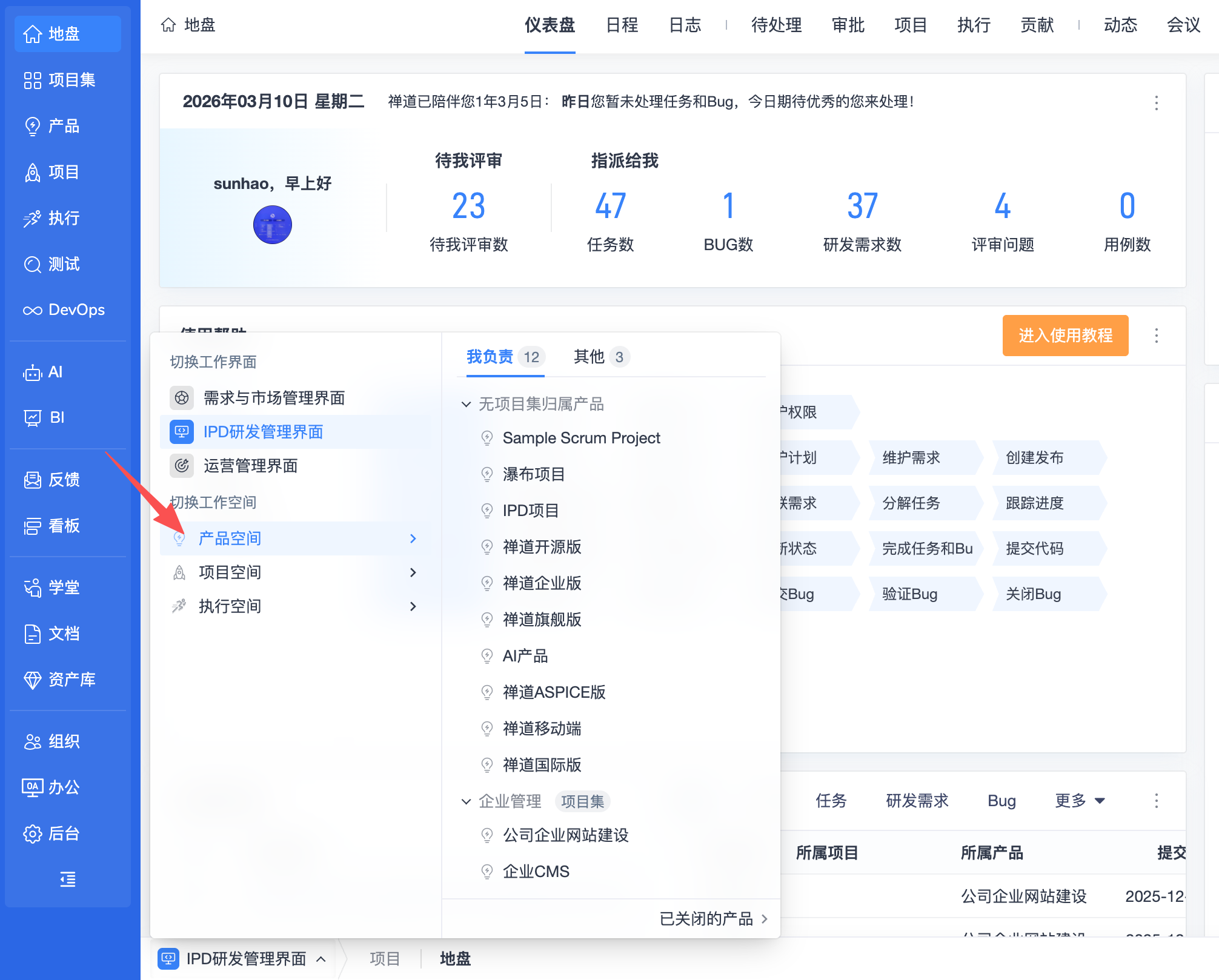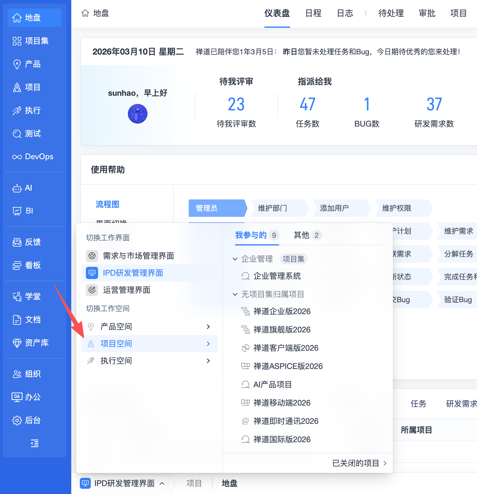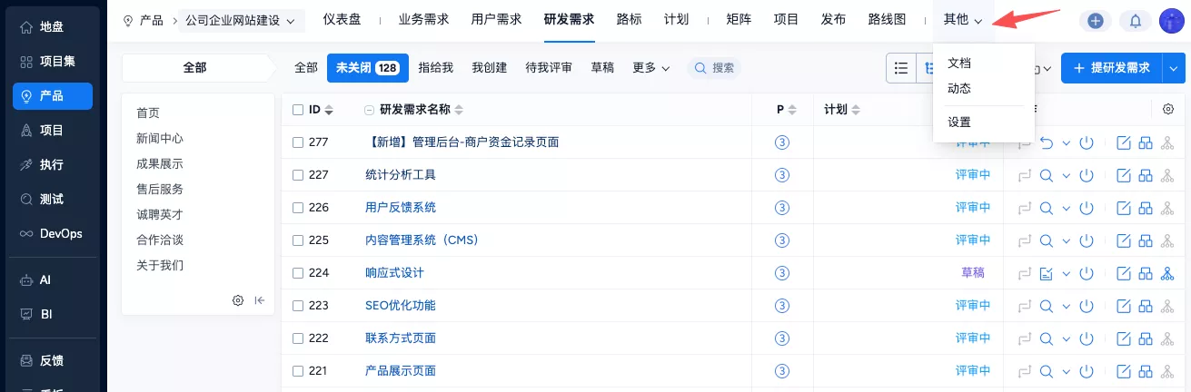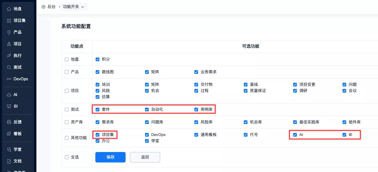 ▼后台功能开关中增加更多可选功能:项目集、套件、用例库、AI、BI、自动化。
